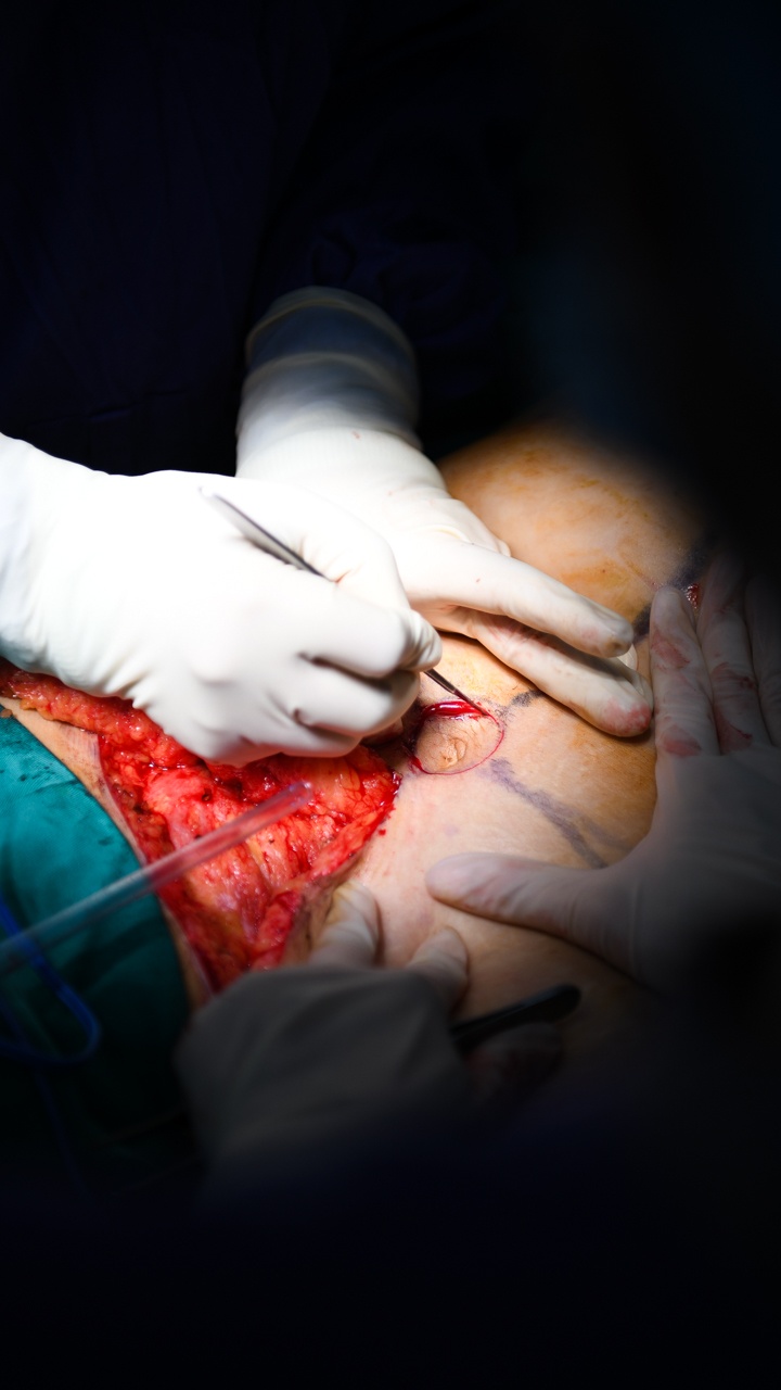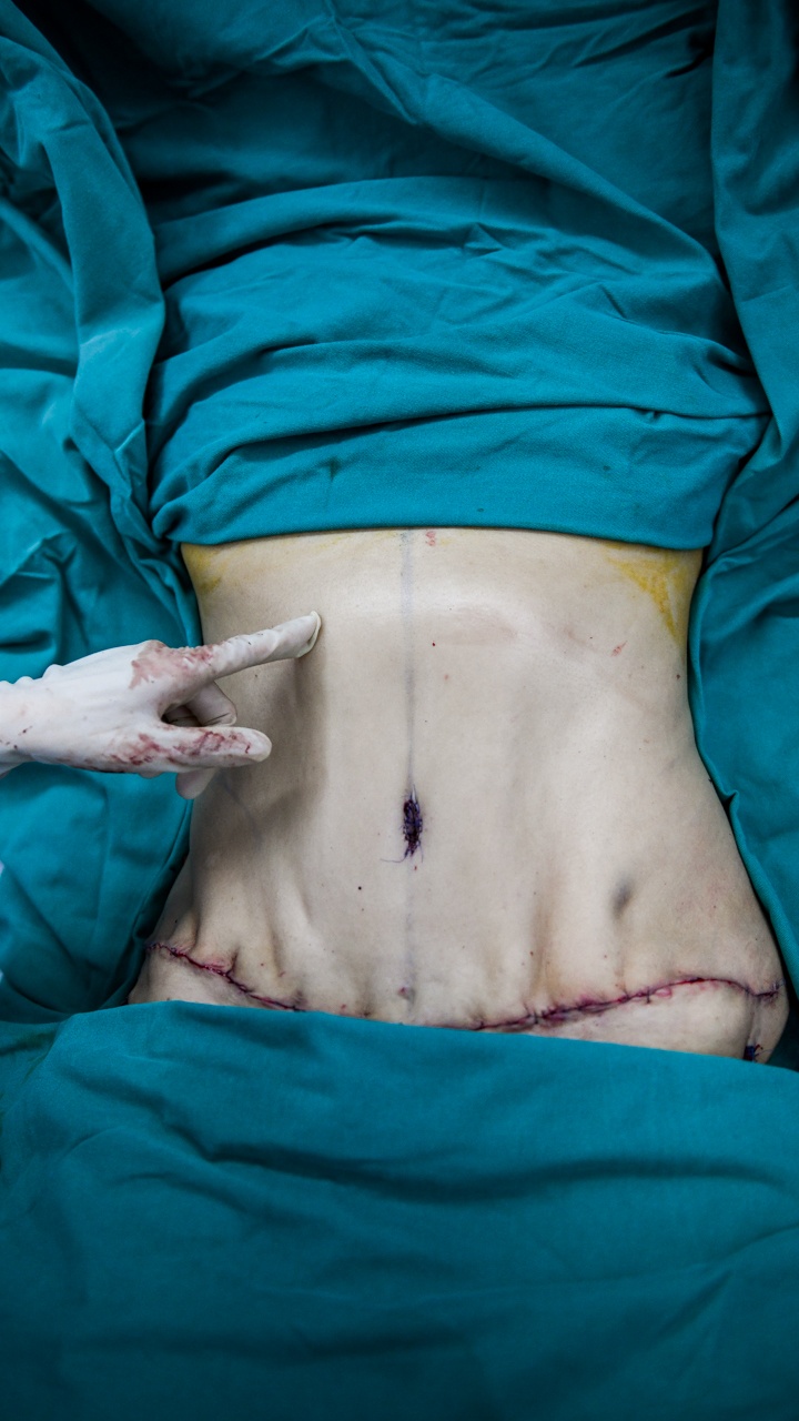 | Bắt đầu ca mổ, chuyên gia tạo hình thẩm mỹ thực hiện một vết cắt lớn ở vùng bụng dưới. Vết rạch thứ hai có tác dụng giải phóng rốn khỏi mô xung quanh. |