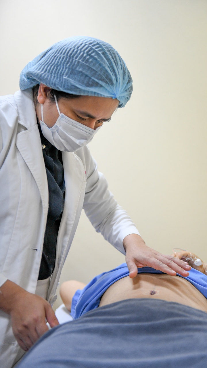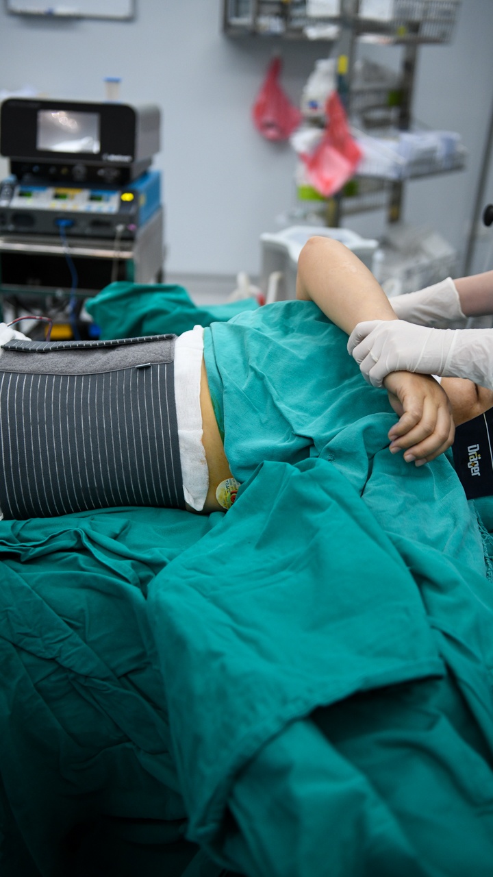 | Hậu phẫu, các y bác sĩ đeo đai định hình bụng cho bệnh nhân. H. được theo dõi sức khỏe, dùng thuốc giảm đau. Sau khoảng 15 phút, bệnh nhân tỉnh lại. |