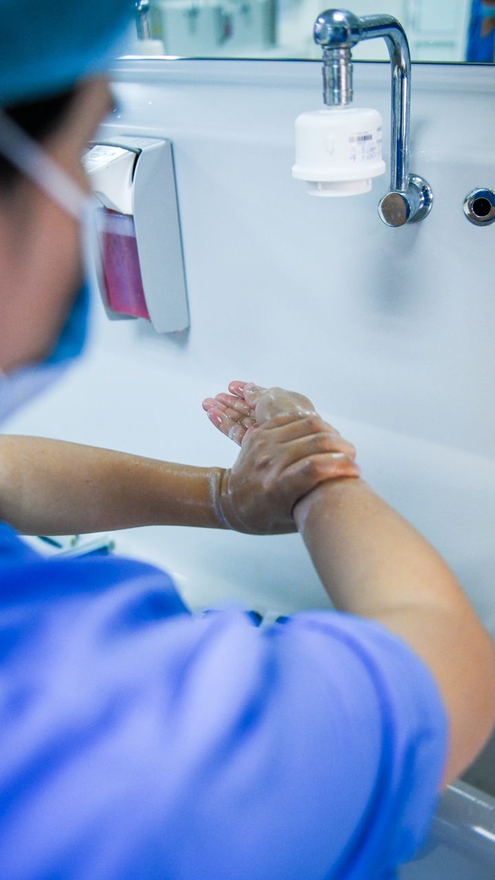 | Trước khi mổ, bác sĩ Việt Dung và toàn bộ ê-kíp vệ sinh sạch sẽ bằng xà phòng khử trùng đặc biệt, thay quần áo để giảm nguy cơ nhiễm khuẩn cho bệnh nhân. |