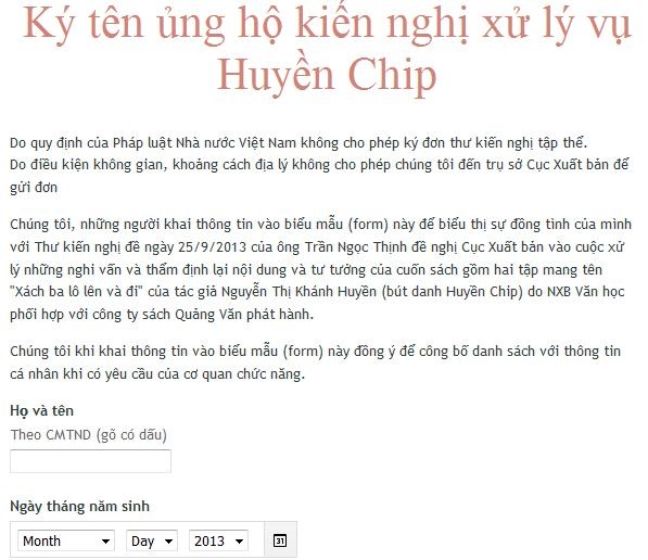 | Mẫu đơn kiến nghị dừng sách Huyền Chip. |