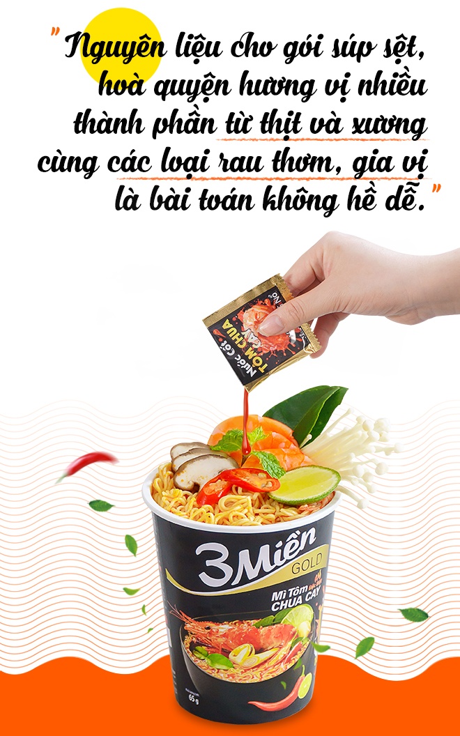 Để làm được điều này, ở quá trình chiên mì, nhiệt độ từng khu vực trong chảo phải được kiểm soát giúp vắt mì không bị quá nhiệt, giảm lượng dầu béo ít nhất có thể. Bên cạnh đó, gói gia vị tạo ra theo hướng tự nhiên, cho vị thanh nhẹ, không gắt, hạn chế dư vị dầu béo. Riêng vị đậm đà - chua - cay của mì 3 Miền tôm chua cay đặc biệt có thể khiến ai từng nếm qua phải nhớ mãi.