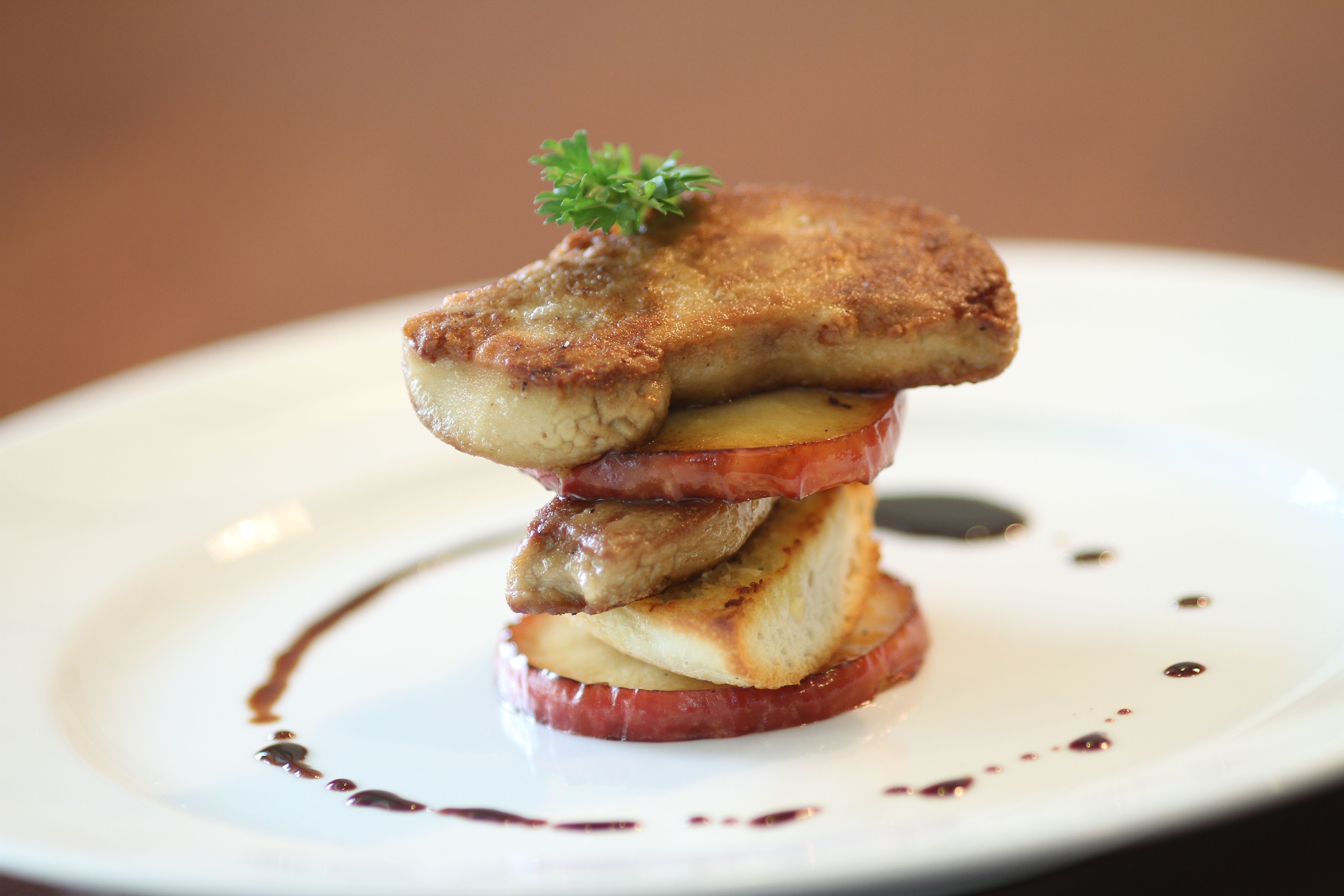 Xếp táo, bánh mì, gan ngỗng lên dĩa, cuối cùng rưới xốt dấm đen lên trên. Dùng khi món nóng.