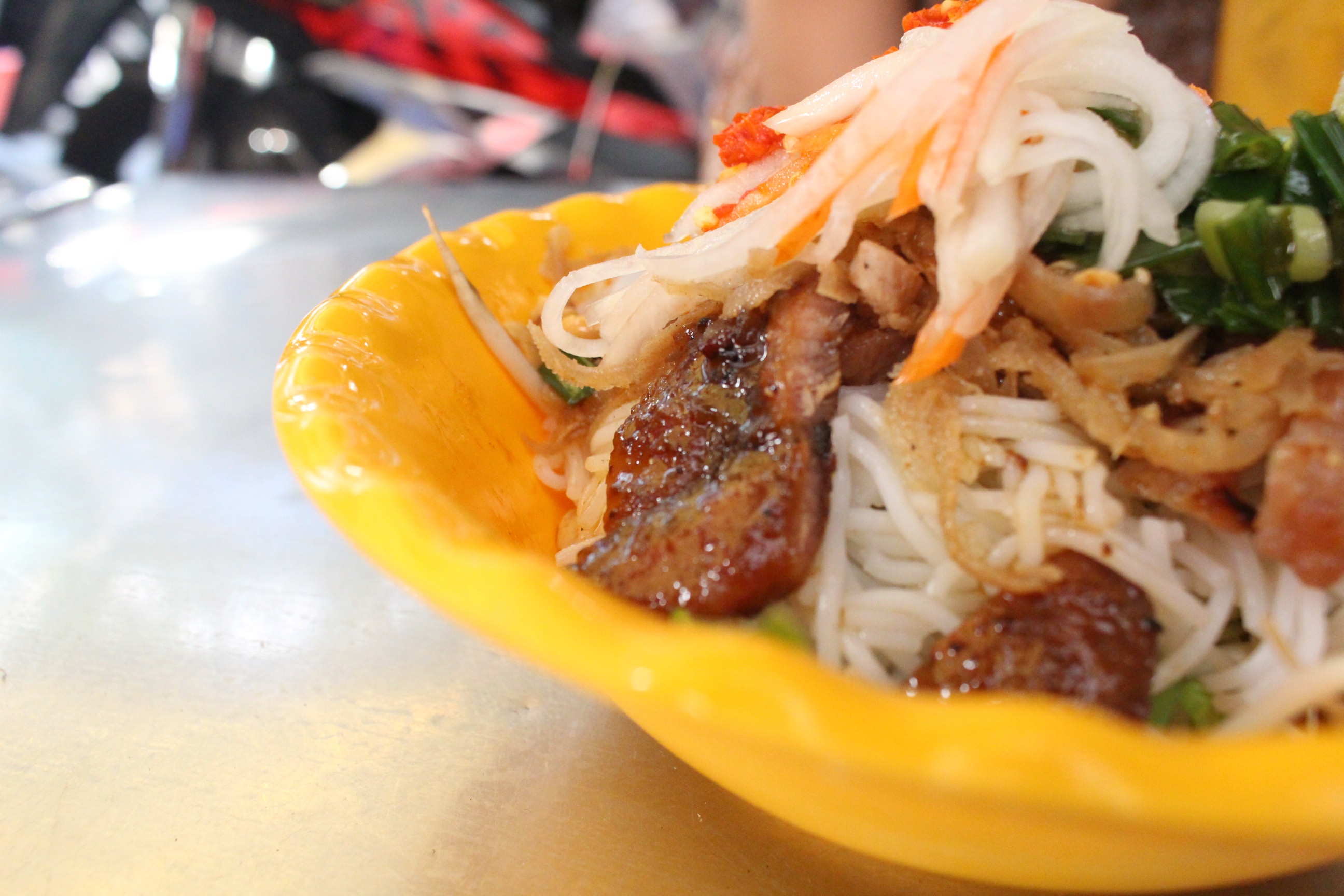 Tô bún bì tại đây có 4 tầng: rau, bún, thịt (nem nướng, thịt nướng, bì) và đồ chua, đậu phộng được chan ngập trong nước mắm. Bạn nên trộn đều để thưởng thức. Tuy nhiên, nhấm nháp riêng từng thành phần sẽ giúp bạn hiểu rõ hơn hương vị cũng như sự độc đáo của món ăn.