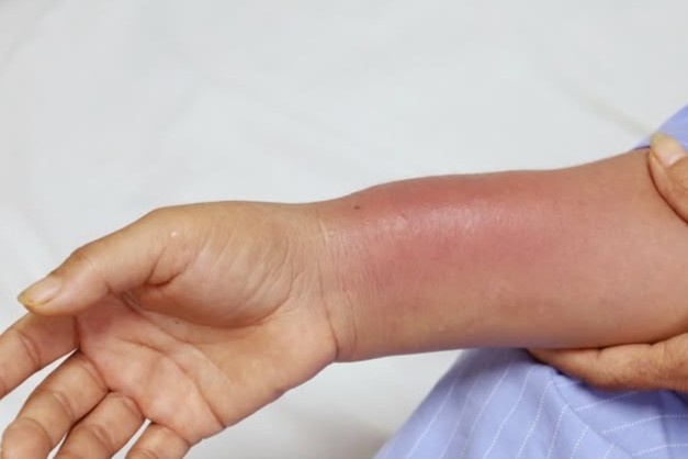 Tuy nhiên, chỉ sau hai ngày, vùng cấy chỉ bắt đầu sưng nóng, đau nhức, và đến ngày thứ chín, cẳng tay sưng to, đỏ, không thể cử động. Lúc này, người bệnh mới đến Bệnh viện Việt Nam - Thụy Điển Uông Bí để thăm khám.