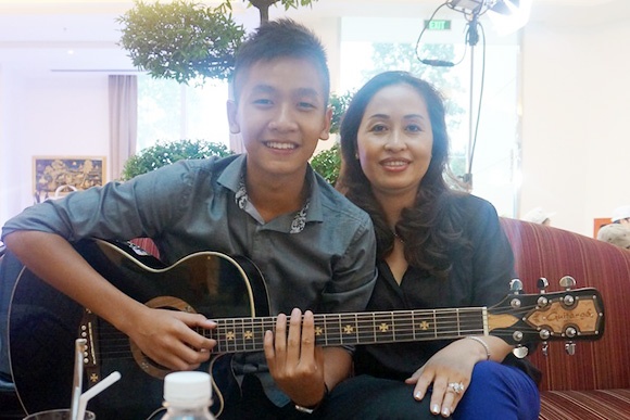 - Thật sự em chỉ tự học chơi guitar từ một năm trở lại đây thôi. Do em thấy có rất nhiều bạn vừa chơi guitar vừa hát rất hay nên em cũng muốn học hỏi theo và phát triển khả năng đó. Em đã tự học guitar bằng cách lên youtube tìm kiếm những clip dạy đánh guitar và đệm hát. Những lúc gặp khó khăn, em hay đi hỏi ba và bạn bè. Ba của Quang là một người chơi guitar rất cừ nên mọi khó khăn đều được ba giúp đỡ và chỉ dẫn thêm.