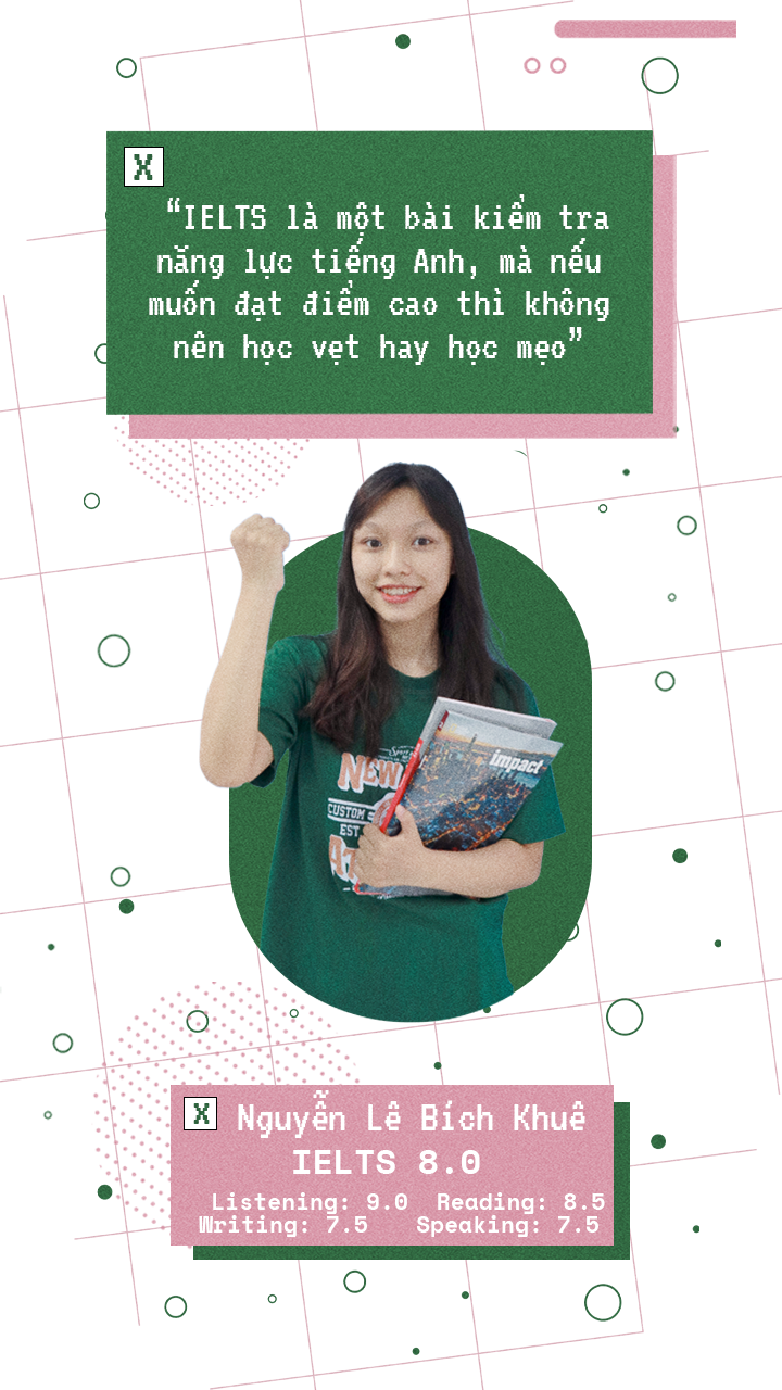 Với Nguyễn Lê Bích Khuê (17 tuổi, Vũng Tàu), chặng đường chinh phục IELTS 8.0 lại nhiều gian nan hơn. Có kiến thức tiếng Anh căn bản, thông dụng khi học tại trường, Khuê gặp nhiều khó khăn trong việc hiểu đề khi tiếp xúc ngôn ngữ học thuật (academic) của các bài IELTS. Cô cũng gặp trở ngại trong cách hành văn và triển khai ý bằng tiếng Anh, do vẫn giữ lối tư duy bẳng tiếng Việt. Áp lực về việc cải thiện từ vựng, khả năng nghe, đọc cũng như lượng bài vở năm học cuối cấp khiến Bích Khuê từng rất lo lắng.