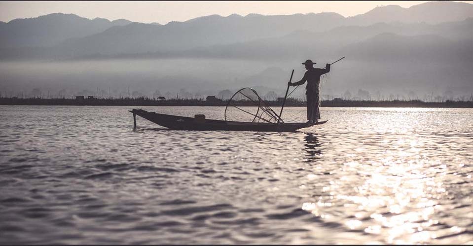 Người dân ở đây chèo thuyền đánh bắt cá chỉ với một chân, đứng ở cuối mũi thuyền, giữ thăng bằng và thả lưới. Đây là cánh đánh bắt rất độc đáo của cư dân Myanmar. |