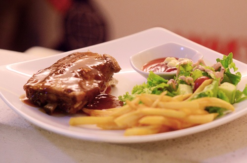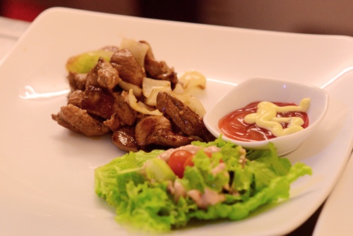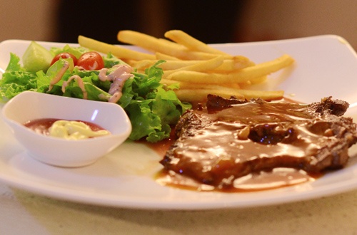 Mỗi phần ăn đều bảo đảm độ no đủ cho thực khách với bộ ba salad dâu tằm, khoai tây chiên hay bánh mì tươi và trà đá. |