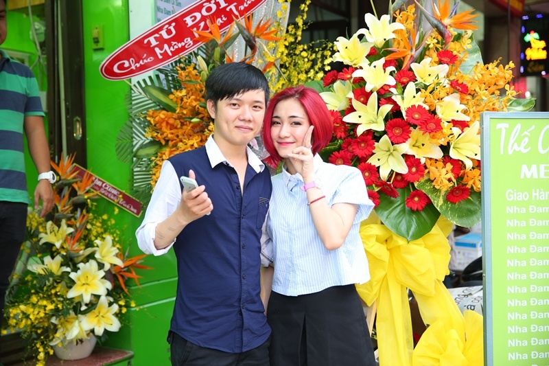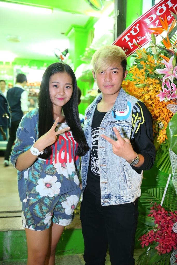 Quản lý Hữu Hoan và nữ ca sỹ Hòa Minzy góp mặt trong ngày khai trương quán.