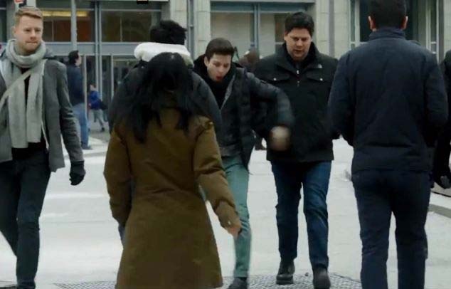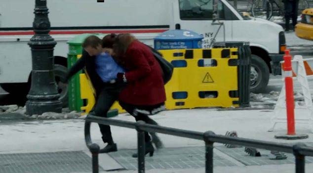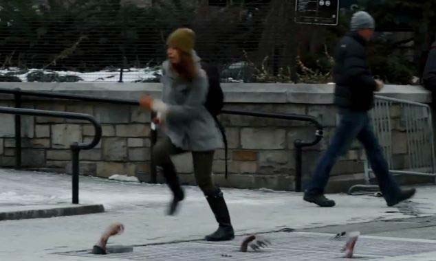 | Cô gái bỏ chạy khi cánh tay nhô lên từ bên dưới mặt đường. Mục đích của việc đóng giả thây ma của nhóm người ở New York là quảng bá cho bộ phim The Walking Dead. Phần 5 của bộ phim sẽ ra mắt khán giả vào ngày 9/2. Ảnh: AMC. |