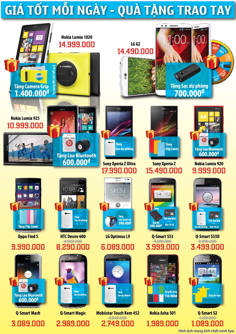 Ngoài ra, còn rất nhiều sản phẩm giảm giá và tặng kèm quà tặng hấp dẫn như: Nokia Lumia 925 giá 10.999.000 đồng tặng loa Bluetooth trị giá 600.000 đồng, Sony Xperia Z Ultra giá 17.990.000 đồng tặng sạc dự phòng, HTC Desire 600 giá chỉ còn 8.290.000 đồng tặng ngay sạc dự phòng…