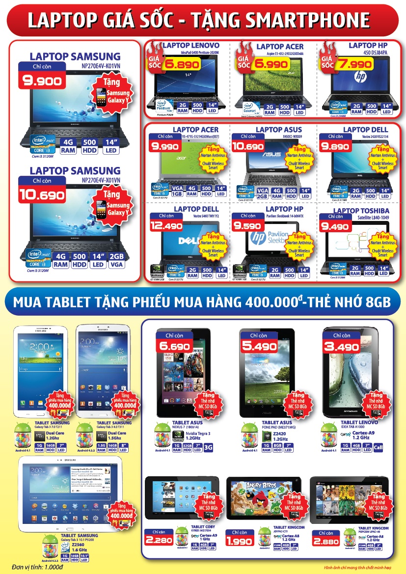 Khách hàng mua Tablet Samsung Galaxy Tab 3 7.0.T211, Galaxy tab 3 8.0.T311, Galaxy tab 3 10.1.P5200 được tặng ngay phiếu mua hàng trị giá 400.000 đồng.