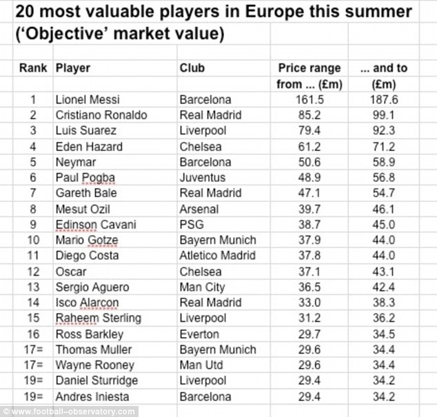 Lần lượt đứng thứ 4 và 5 trên BXH là Eden Hazard (61,2 đến 71,2 triệu bảng) và Neymar (50,6 đến 58,9 triệu bảng). Khá bất ngờ khi cựu sao mai của M.U, Paul Pogba (48,9 đến 56,8 triệu) thậm chí còn có giá trị chuyển nhượng cao hơn cả Gareth Bale (47,1 đến 54,7 triệu bảng), người đang giữ kỷ lục về mức phí chuyển nhượng khi buộc Real phải bỏ ra 86 triệu bảng hồi mùa hè năm ngoái.