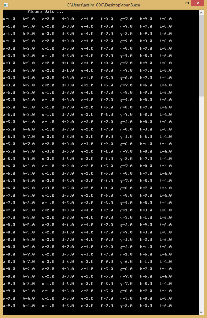 Kết quả thực hiện chương trình cho ra vô số bộ giá trị thỏa mãn bài toán. Đây là phần kết quả thực hiện trên máy tính với bộ VXL Intel Core i7 – 4510U. Cũng may là trong bài này n = 9. (3)