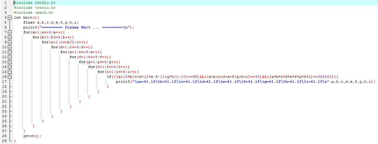 Nói một chút về chuyên môn, chương trình trên sử dụng 9 vòng lặp for để quét tất cả các trường hợp có thể và in ra màn hình tất cả bộ giá trị thỏa mãn đề bài. Do đó, nếu coi các phép toán so sánh và số học là những phép toán cơ bản, thì thời gian chạy của chương trình trên ước tính là O(n^9 ) (với n là phạm vi của ẩn số từ 0 đến n).
