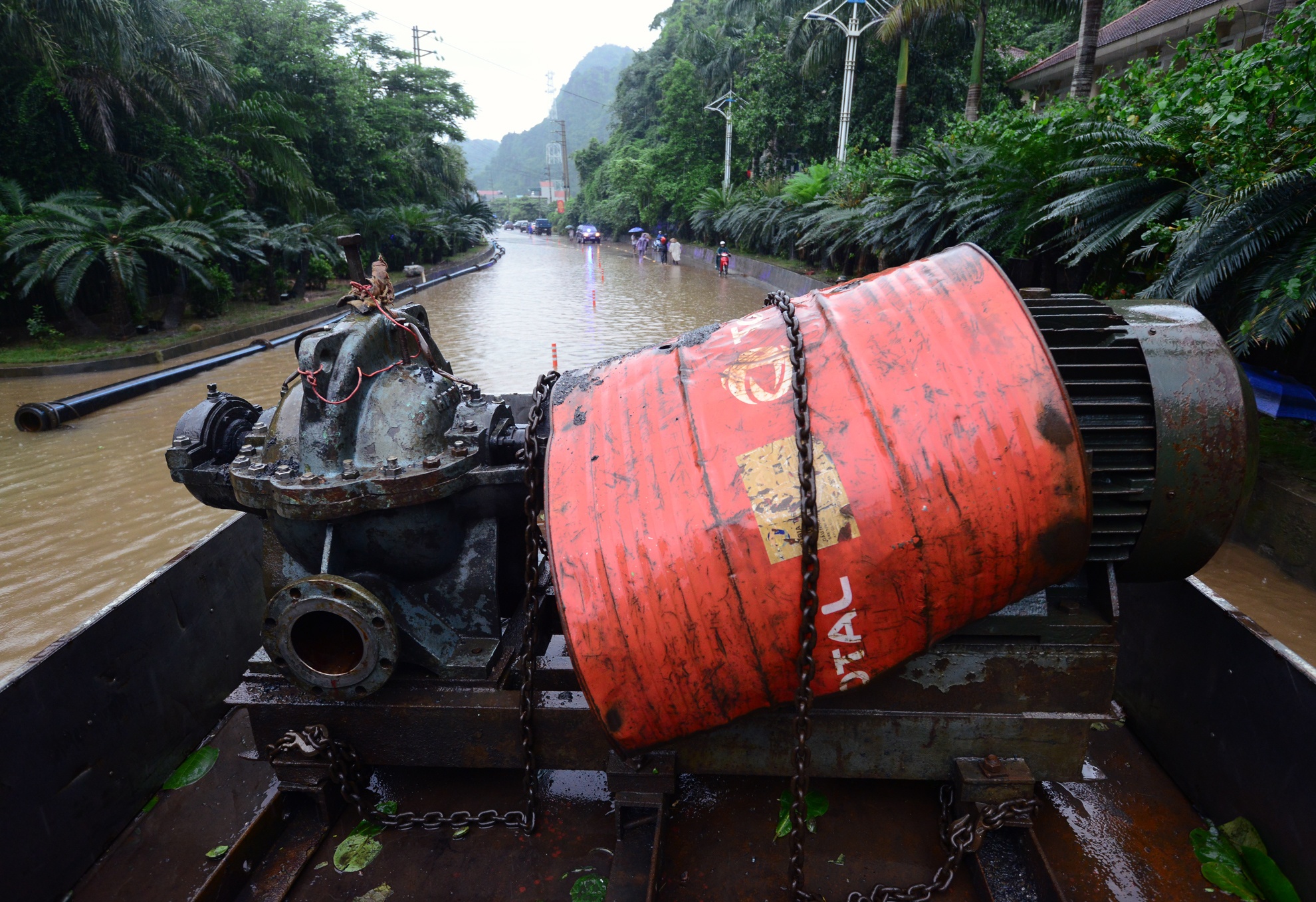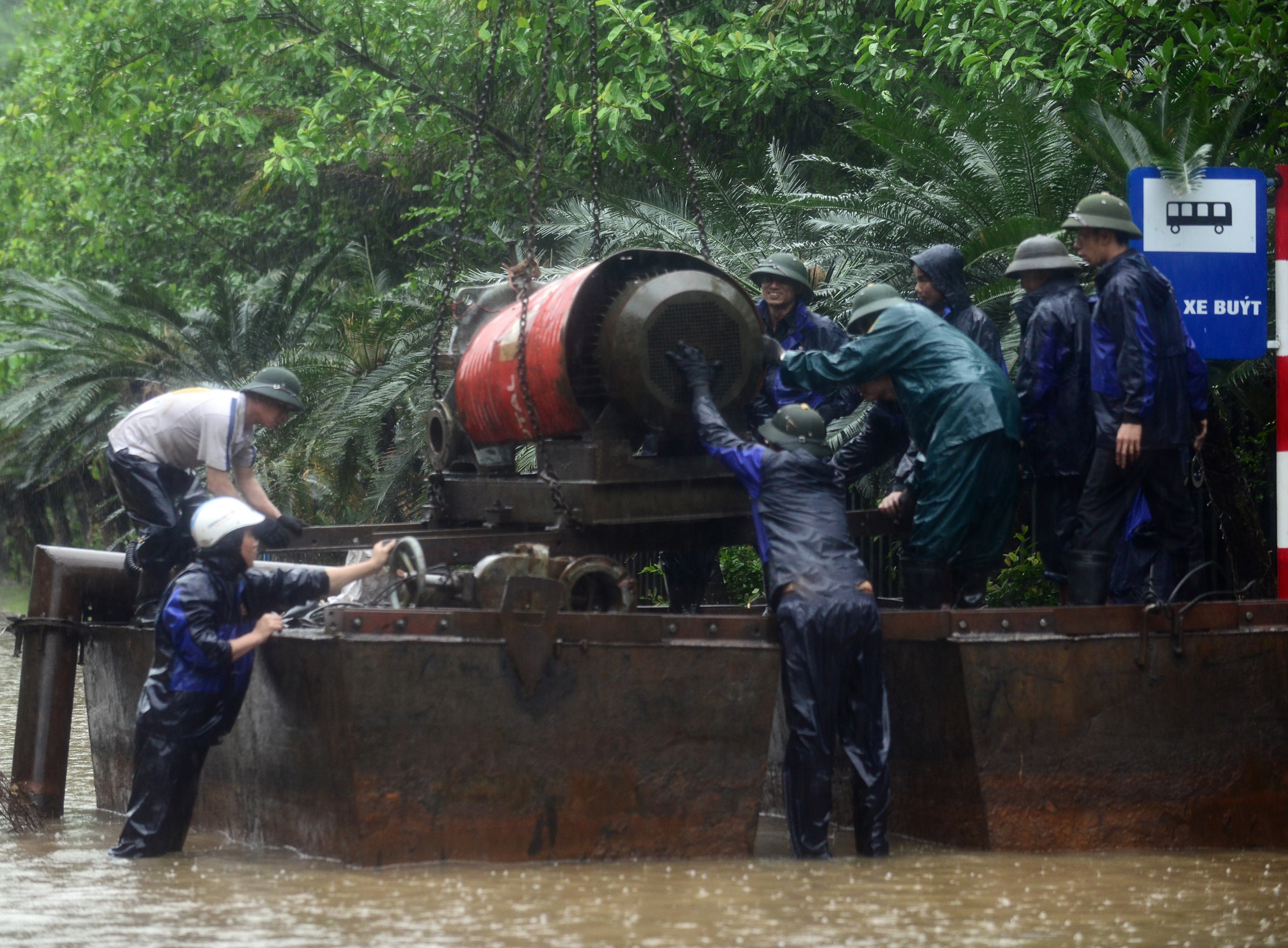 | Sau khi đảm bảo an toàn tại cây xăng Đèo Bụt, công tác hút nước bắt đầu được triển khai. |