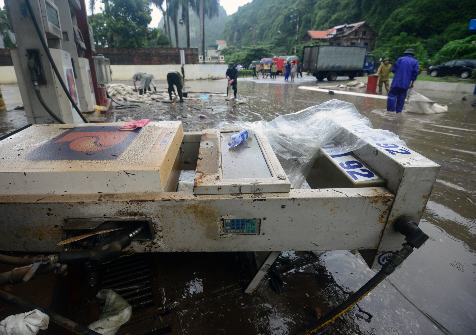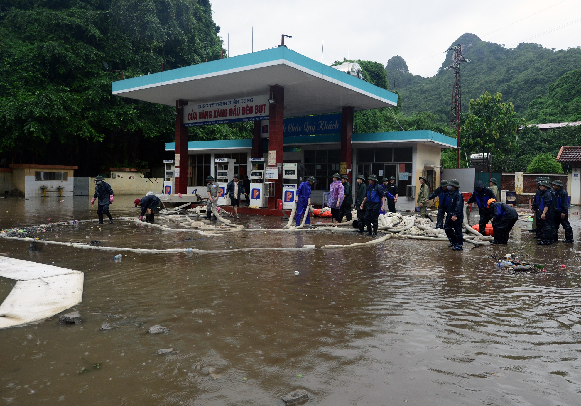 Trạm xăng Đèo Bụt nằm bên quốc lộ 18A vừa được lực lượng chức năng hút dầu tách nước để chuẩn bị thông đường vào đêm 30/7.