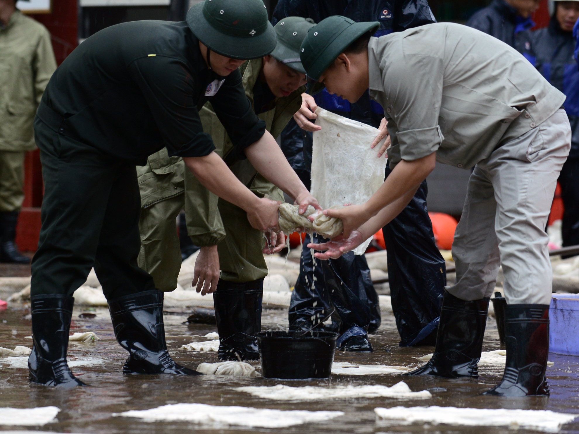 Chiều 30/7, hơn 150 chiến sĩ bao gồm quân đội, công an, đơn vị xăng dầu Quảng Ninh cùng cán bộ công nhân viên của Tổng công ty Đông Bắc - Bộ Quốc phòng tập trung khắc phục hậu quả tràn xăng dầu.
