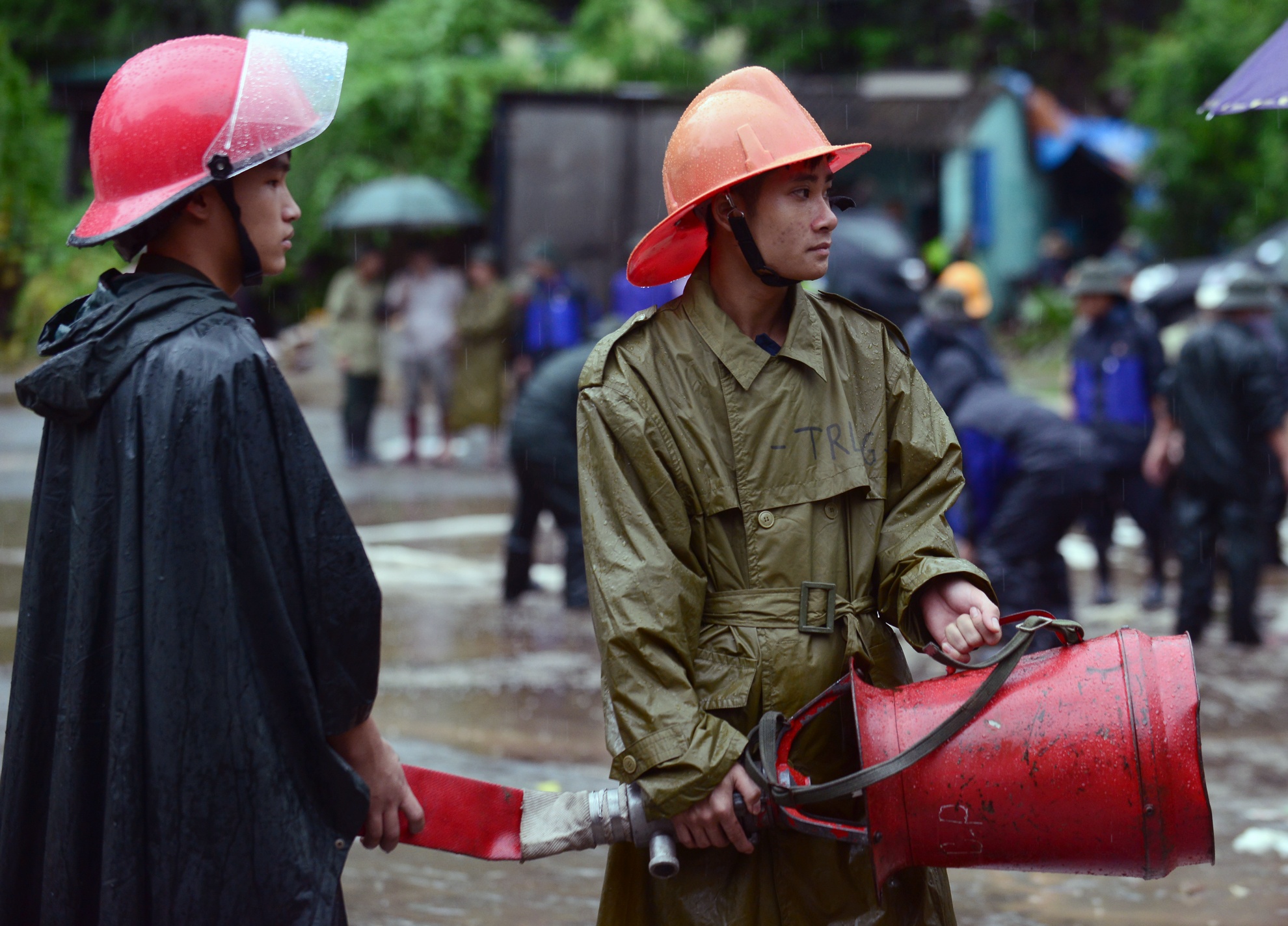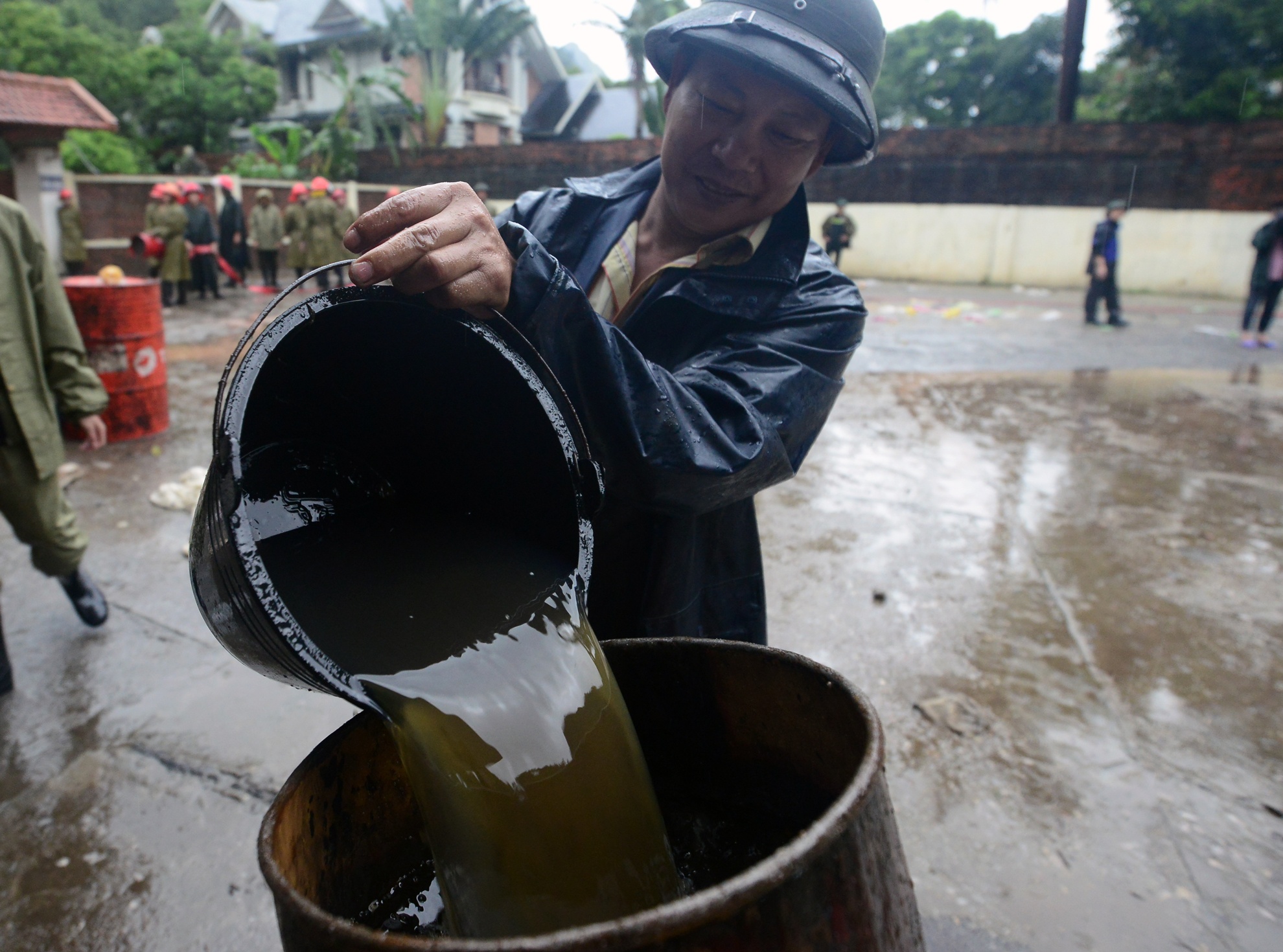 Công đoạn tách dầu khỏi nước để đảm bảo an toàn xung quanh khu vực cây xăng trước khi đưa xe tiếp nhiên liệu vào hút số xăng dầu còn lại dưới bể chứa. Đơn vị PCCC Quảng Ninh cho biết, để đảm bảo an toàn cho việc hút nước, thông xe trong tối 30/7, họ bắt buộc phải đảm bảo an toàn để ngăn cháy nổ và các tình huống phát sinh. Việc hút nhiên liệu trở lại xe bồn vô cùng nguy hiểm và phức tạp do các bể chứa bị ép không khí trong vài ngày qua, rất dễ cháy nổ.