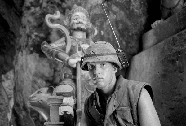 | Binh sĩ David L. Cruz nghe tin tức về tàu Apollo bằng radio gắn trên mũ khi đứng gác tại Núi Đá, Đà Nẵng, ngày 17/7/1969. |