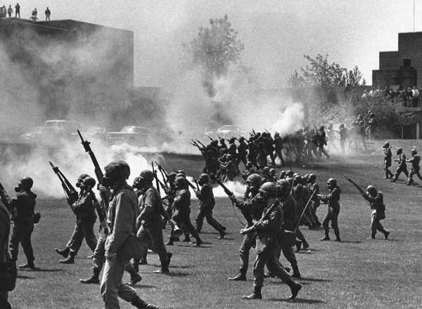 | Vệ binh quốc gia giải tán những sinh viên Đại học Kent tại bang Ohio (Mỹ) khi họ tham gia biểu tình phản đối cuộc chiến tranh ở Việt Nam ngày 4/5/1970. Bốn người thiệt mạng và 11 người bị thương khi lực lượng vệ binh nổ súng. |