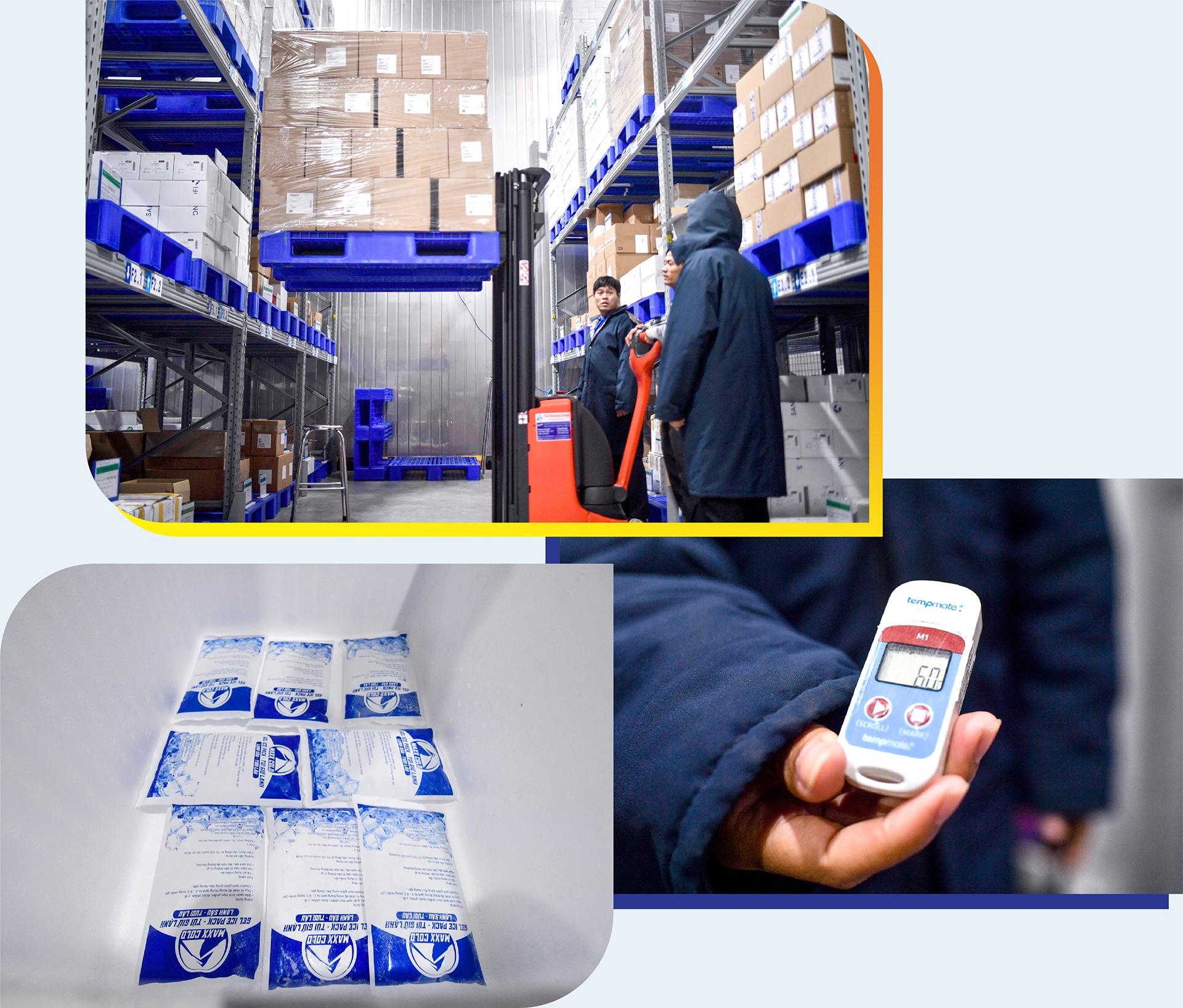 Tại VNVC, quy trình vận chuyển tuân thủ bộ tiêu chí khắt khe để đảm bảo vaccine được lưu trữ trong điều kiện lý tưởng nhất. Khi có lệnh cấp phát, vaccine được đóng gói vào thùng lạnh với đá gel giúp giữ nhiệt ổn định ở mức 2-8 độ C. Tất cả thùng lạnh được gắn data log - thiết bị được ví như “hộp đen” của vaccine, cho phép bộ phận kiểm định chất lượng truy xuất dữ liệu nhiệt độ suốt hành trình, theo dõi mức nhiệt theo thời gian thực. Đây cũng là căn cứ để bộ phận kiểm định tại VNVC đánh giá chất lượng vaccine trong quá trình vận chuyển, đảm bảo đủ tiêu chuẩn nhập kho.