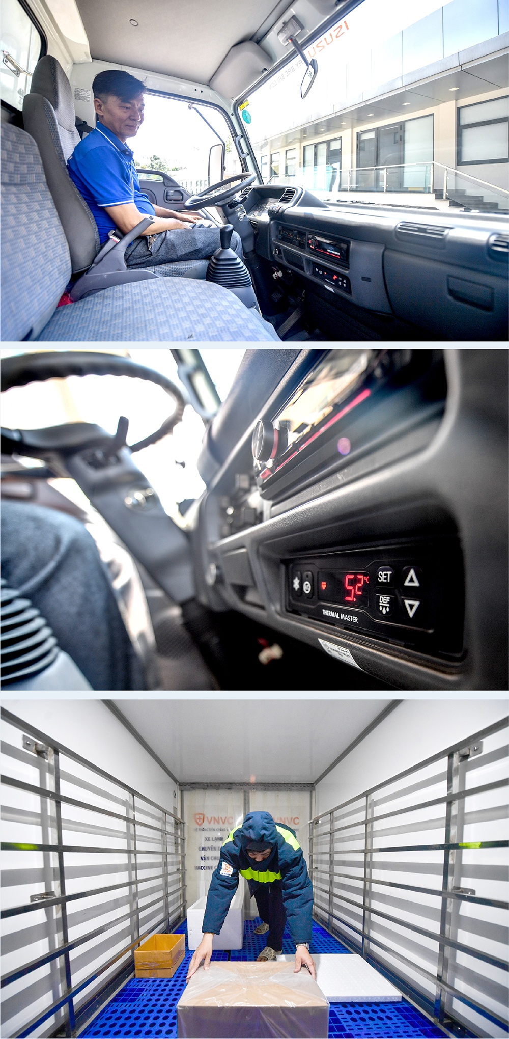 Khi nhận lệnh vận chuyển, hệ thống xe lạnh sẵn sàng đưa vaccine đến nơi cấp phát. Trong suốt hành trình vận chuyển, nhiệt độ thùng lạnh thường xuyên được kiểm tra thông qua màn hình hiển thị ở buồng lái. Đồng thời, nhân viên vận chuyển vaccine chuẩn bị các bình tích lạnh hoặc đá gel để thay thế hoặc bổ sung trong trường hợp nhiệt độ vượt ngưỡng 7 độ C.
