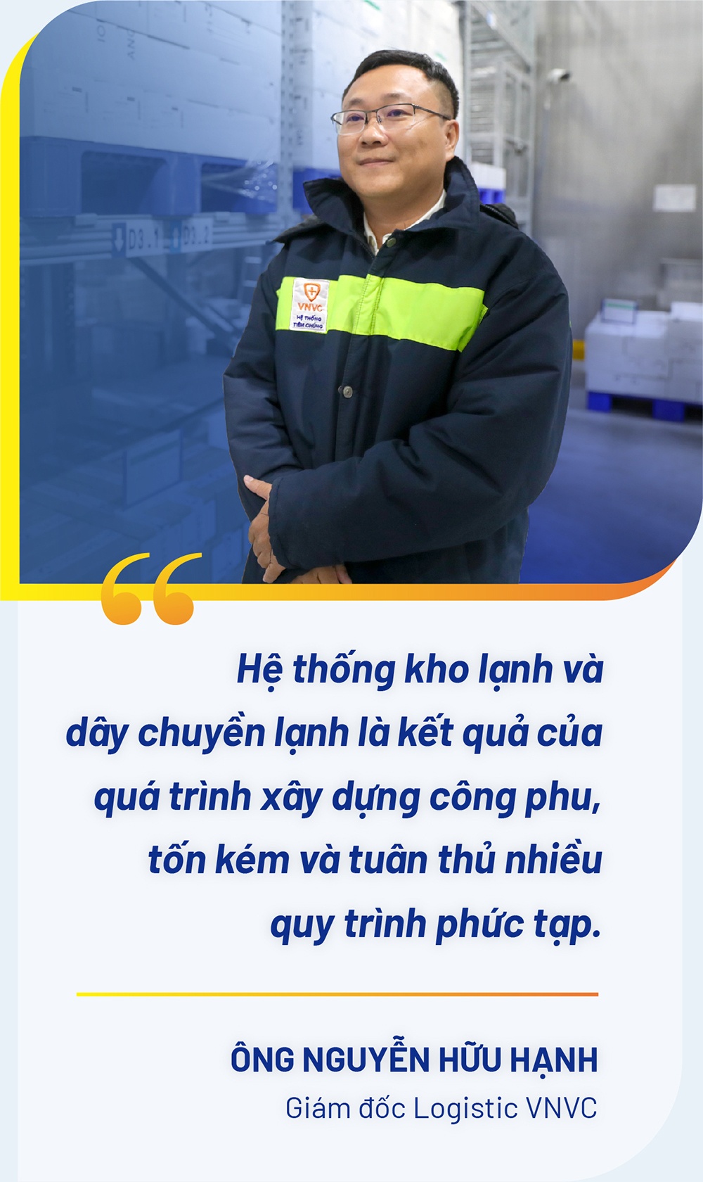 “Hệ thống kho lạnh và dây chuyền lạnh là kết quả của quá trình xây dựng công phu, tốn kém và tuân thủ nhiều quy trình phức tạp. Tuy nhiên vấn đề cốt lõi là con người. Tại VNVC chúng tôi không chỉ sở hữu hệ thống kho lạnh, dây chuyền lạnh bảo quản vaccine hàng đầu mà còn có đội ngũ quản lý chất lượng vaccine, kho vận, logistic chuyên nghiệp. Kho vaccine của VNVC không chỉ trị giá hàng trăm triệu USD mà còn là sức khỏe của hàng chục triệu người dân. Do đó, chúng tôi không thể lơ là dù chỉ một giây”, ông Hạnh nói thêm.