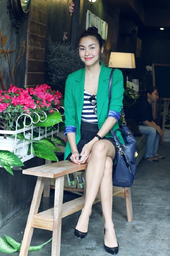 | Chiếc blazer màu xanh emerald từng làm mưa làm gió trên thị trường thời trang cao cấp thời gian qua kết hợp cùng phần áo kẻ sọc trẻ trung và chân váy xếp tầng dễ thương đem đến cho Hà Tăng một hình ảnh tươi mới, năng động và không kém phần nữ tính. |
