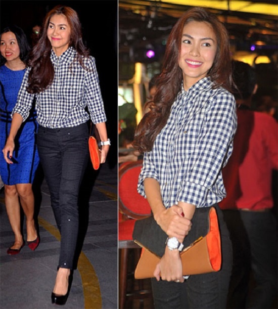| Sơ mi caro cài kín cổ giúp Hà Tăng che đi được kha khá khuyết điểm vòng 1 khiêm tốn. Clutch bigsize tạo điểm nhấn cho bộ trang phục đơn giản cũng là item được cô nàng rất ưu ái. |