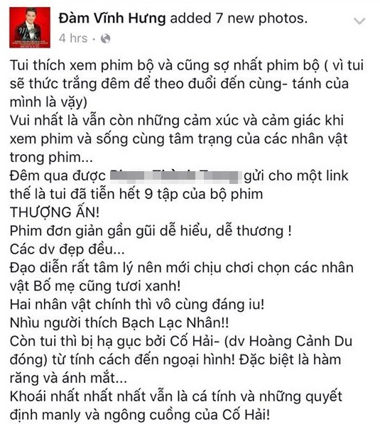 Nghệ sĩ Đàm Vĩnh Hưng cũng mất ăn mất ngủ khi xem phim. Trên trang cá nhân, anh chia sẻ "cảm giác sống cùng tâm trạng của các nhân vật trong phim". Theo nam ca sĩ Say tình, Thượng Ẩn đơn giản, gần gũi, dễ hiểu cùng dàn diễn viên có ngoại hình ưa nhìn đã mang đến sự mới lạ. Anh còn tiết lộ rất thích nhân vật nam chính Cố Hải do Hoàng Cảnh Du đóng.