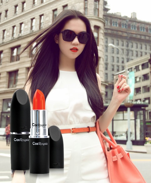| Son môi Cos Royale màu cam tươi, giỏ xách cam đã tạo nên thương hiệu nổi bật đặc biệt của Ngọc Trinh. |