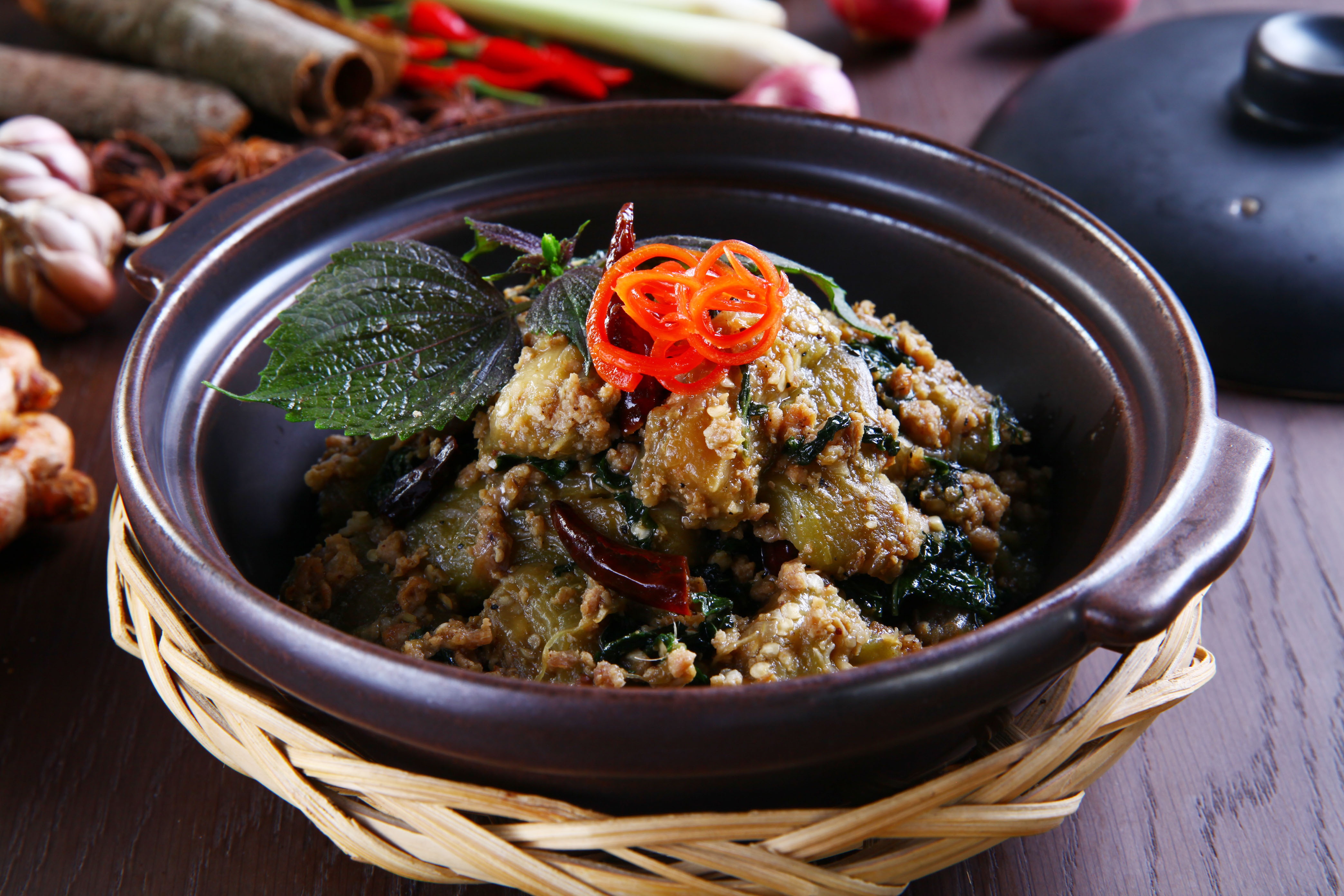 - Khoảng 10 phút sau, mở nắp nồi, nêm vừa ăn. Trang trí món ăn với rau tía tô, ớt xắt sợi và ớt khô. Món này ăn nóng với cơm.