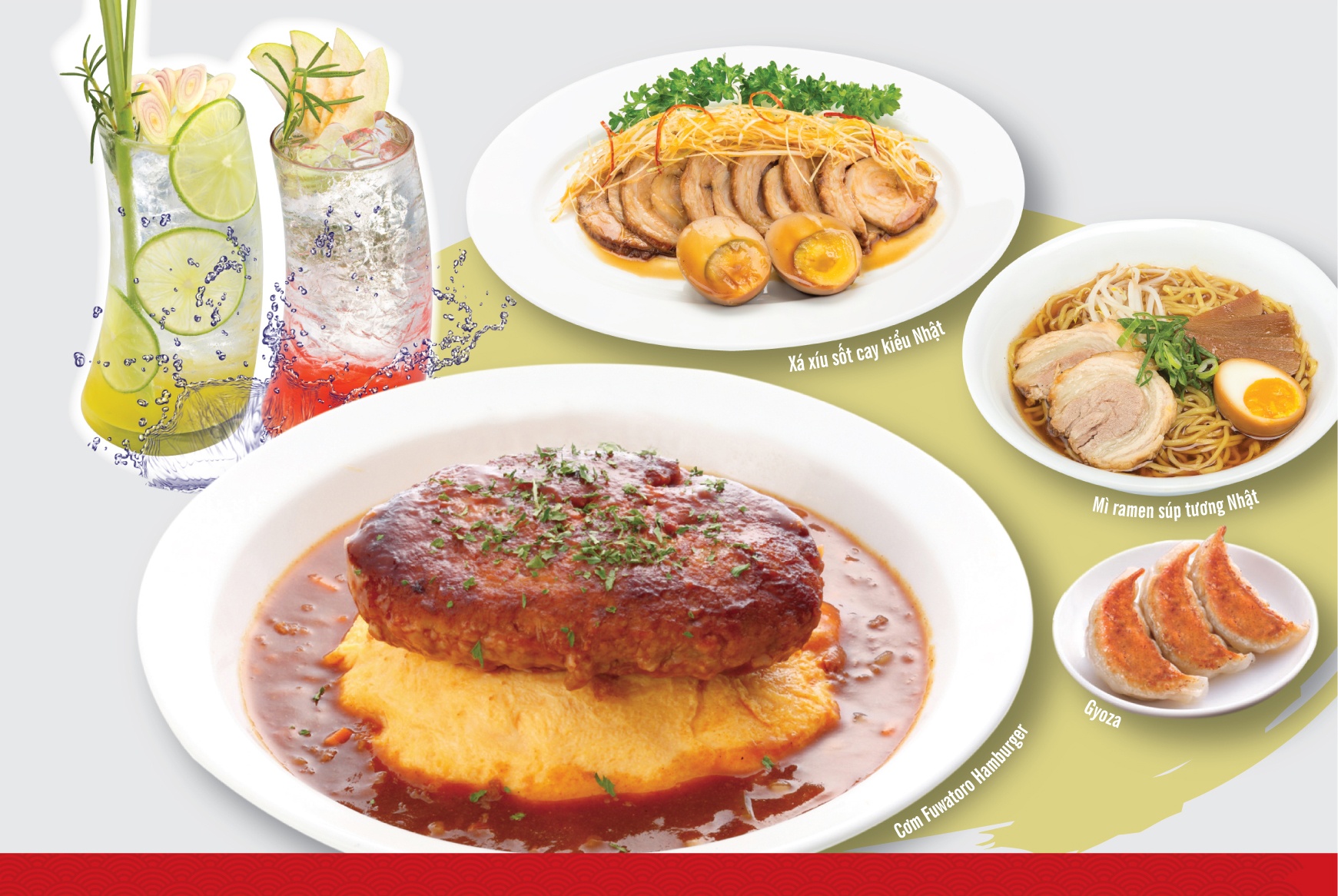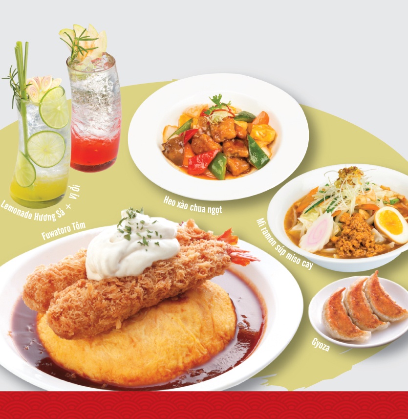 Combo Natsu Osaka: cơm fuwatoro hamburger, mì ramen súp tương Nhật, xá xíu sốt cay kiểu Nhật, gyoza 3 miếng, lemonade hương sả/vị ổi. |