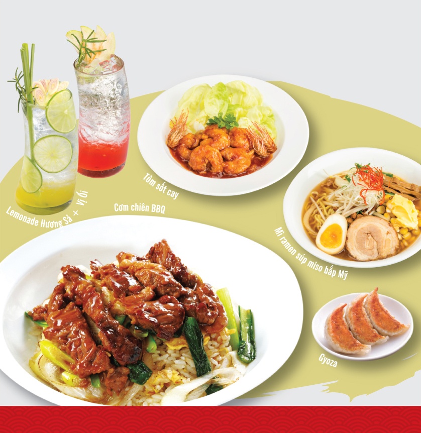 Combo Natsu Hanabi: cơm chiên BBQ, mì ramen súp miso bắp Mỹ, tôm sốt cay, gyoza 3 miếng, lemonade hương sả/vị ổi. |