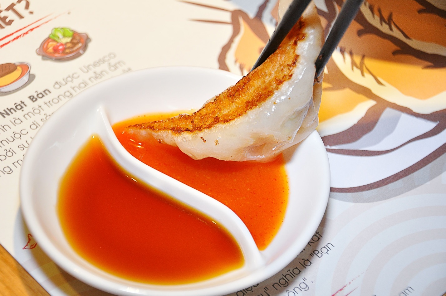 Món gyoza có vị thơm, giòn rụm một mặt, mặt còn lại dai béo nhưng không ngấy. |