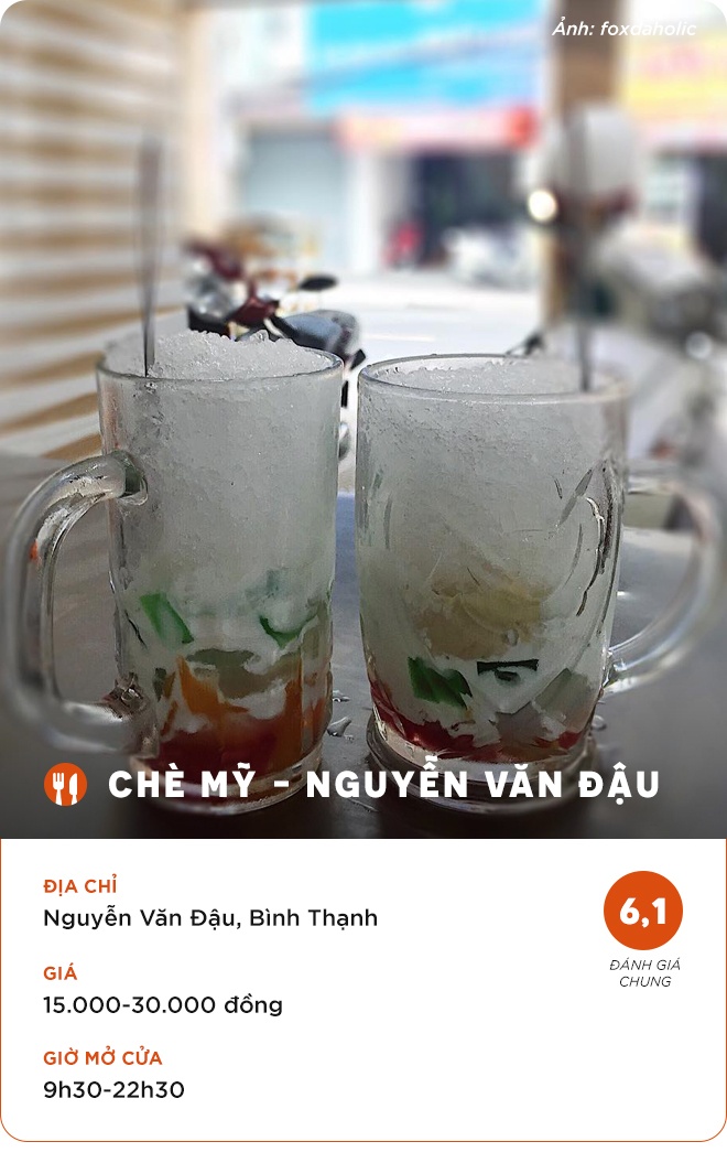 Khánh Quỳnh Nguyễn: "Chè Mỹ, chè Thái, chè cocktail là những món nên thử. Chè Thái ít sầu riêng nhưng các topping còn lại ăn rất ngon. Chè Mỹ tương tự chè Thái nhưng không có sầu riêng. Chè mua mang về được kèm đá xay nhuyễn cùng nước dừa".