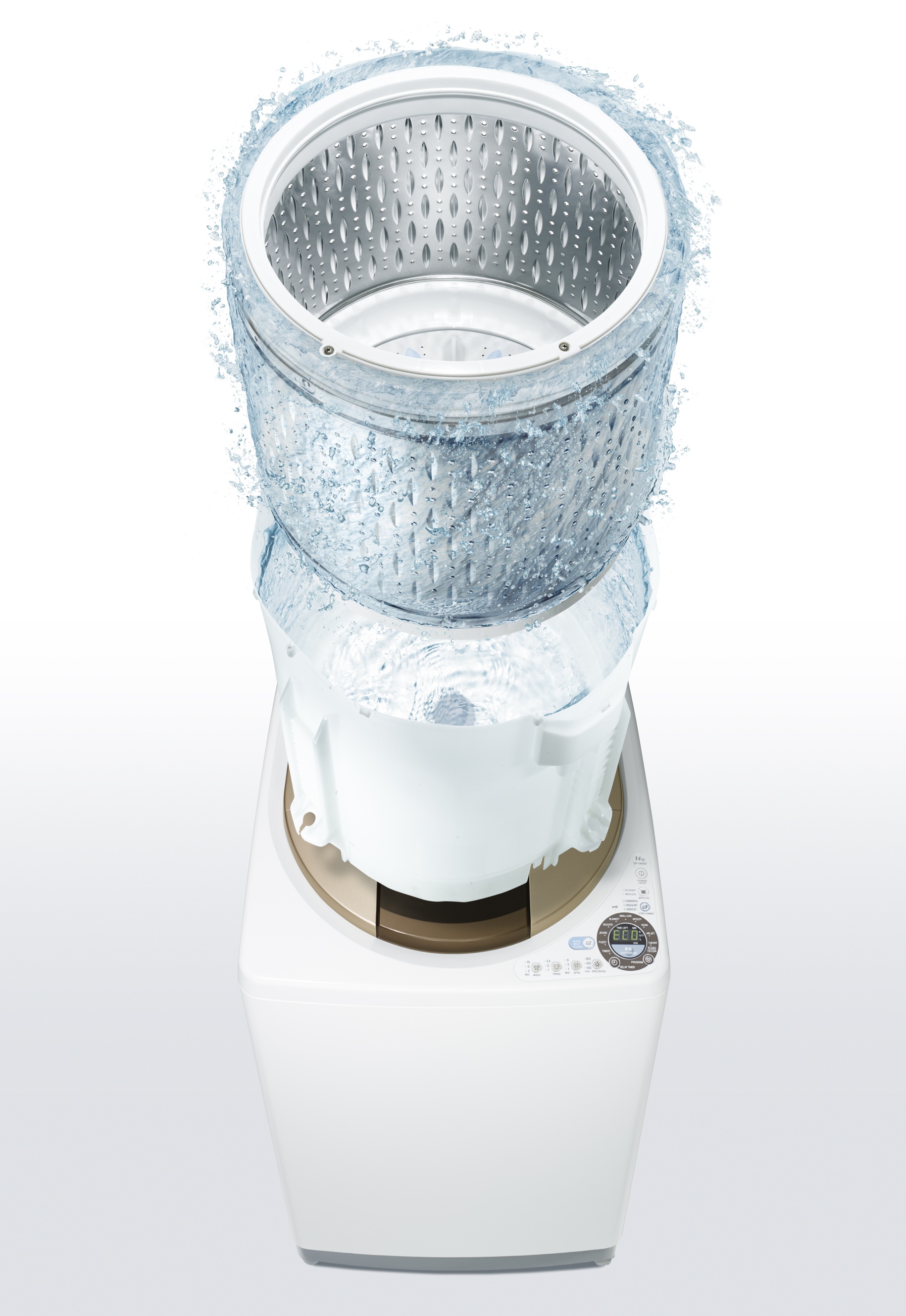 Bằng công nghệ hiện đại, nước sạch cũng sẽ được phun vào cả hai lồng giặt để chùi rửa khi lồng giặt đang quay ở tốc độ cao; cánh trên mâm giặt và lồng giặt sẽ quay mạnh để tạo luồng nước giúp đánh tan và làm sạch chất bẩn.