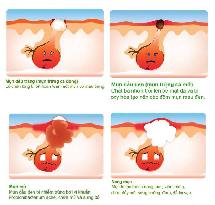 Khi đó, các vi khuẩn có sẵn trong nang lông tuyến bã là P.acnes tăng sinh và gây viêm nhiễm tại chỗ. Một số vi khuẩn khác như tụ cầu khuẩn, Pitynosporium... xâm nhập vào nang lông gây bội nhiễm tạo nên các mụn mủ, mụn bọc. Một số yếu tố làm mụn trứng cá nặng thêm như sinh hoạt không điều độ (ăn nhiều chất cay nóng, sử dụng các chất kích thích, uống nhiều rượu, bia cafe, thức khuya, mất ngủ...); hoặc lạm dụng chế phẩm bôi ngoài da chứa corticoid...