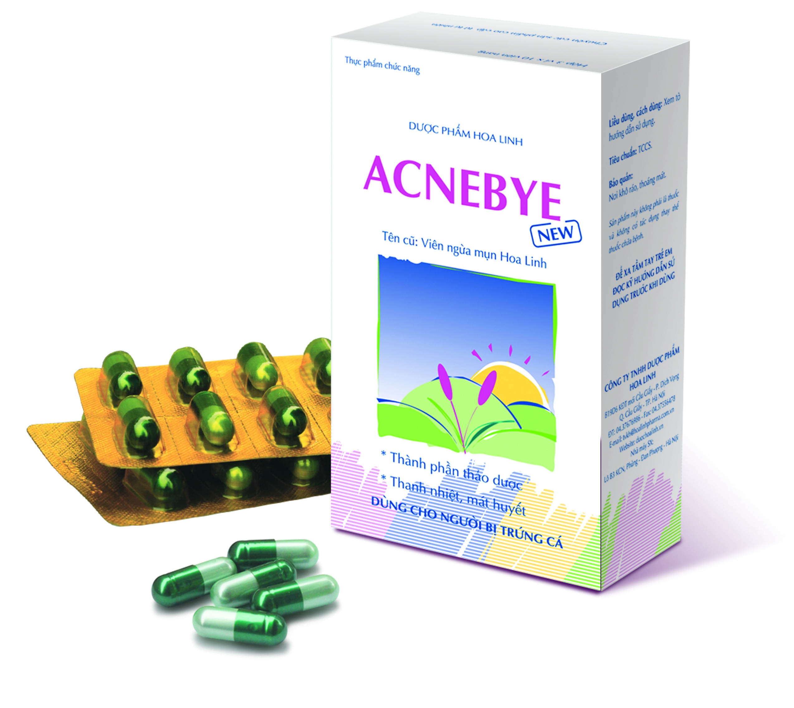 ACNEBYE (tên cũ: viên ngừa mụn Hoa Linh) do công ty dược phẩm Hoa Linh sản xuất có nguồn gốc từ bài thuốc cổ phương, gồm các vị dược liệu như bồ công anh, ngưu hoàng, kim ngân hoa, xuyên tâm liên… được bào chế dạng viên nang, thuận tiện khi sử dụng. Sản phẩm giúp thanh nhiệt, lương huyết, tiêu viêm, trừ nhiệt độc tích tụ trên da, tái lập cân bằng sinh lý da, chống mụn mọc thêm, giảm mụn tái phát. Đặc biệt, sản phẩm hiệu quả hơn với các trường hợp mụn trứng cá do nhiệt. Khi điều trị bằng thuốc dùng ngoài hoặc kháng sinh nếu dùng kết hợp với sản phẩm sẽ tạo tác dụng hiệp đồng giúp việc điều trị đạt hiệu quả tốt hơn.