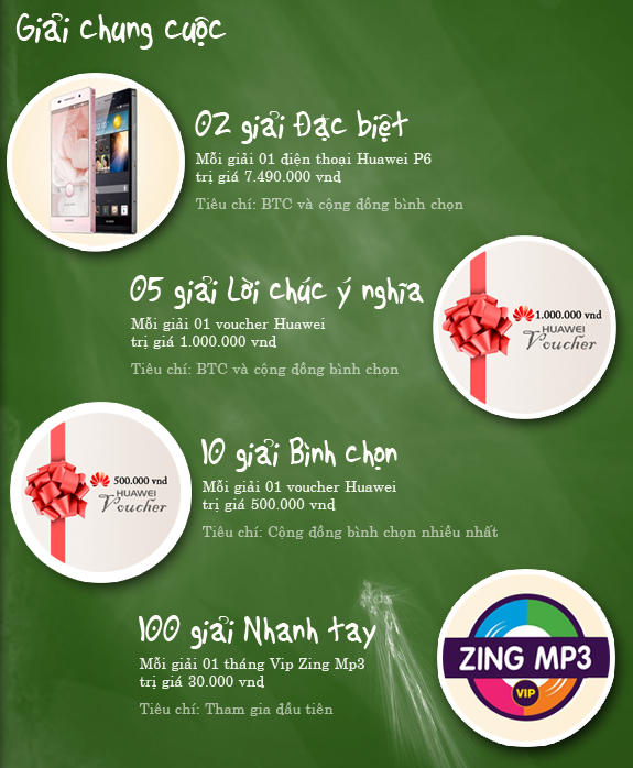 Bên cạnh đó, tham gia cuộc thi, bạn còn có cơ hội nhận ngay điện thoại Huawei P6 và nhiều giải thưởng khác với tổng giá trị lên đến hơn 30 triệu đồng.
