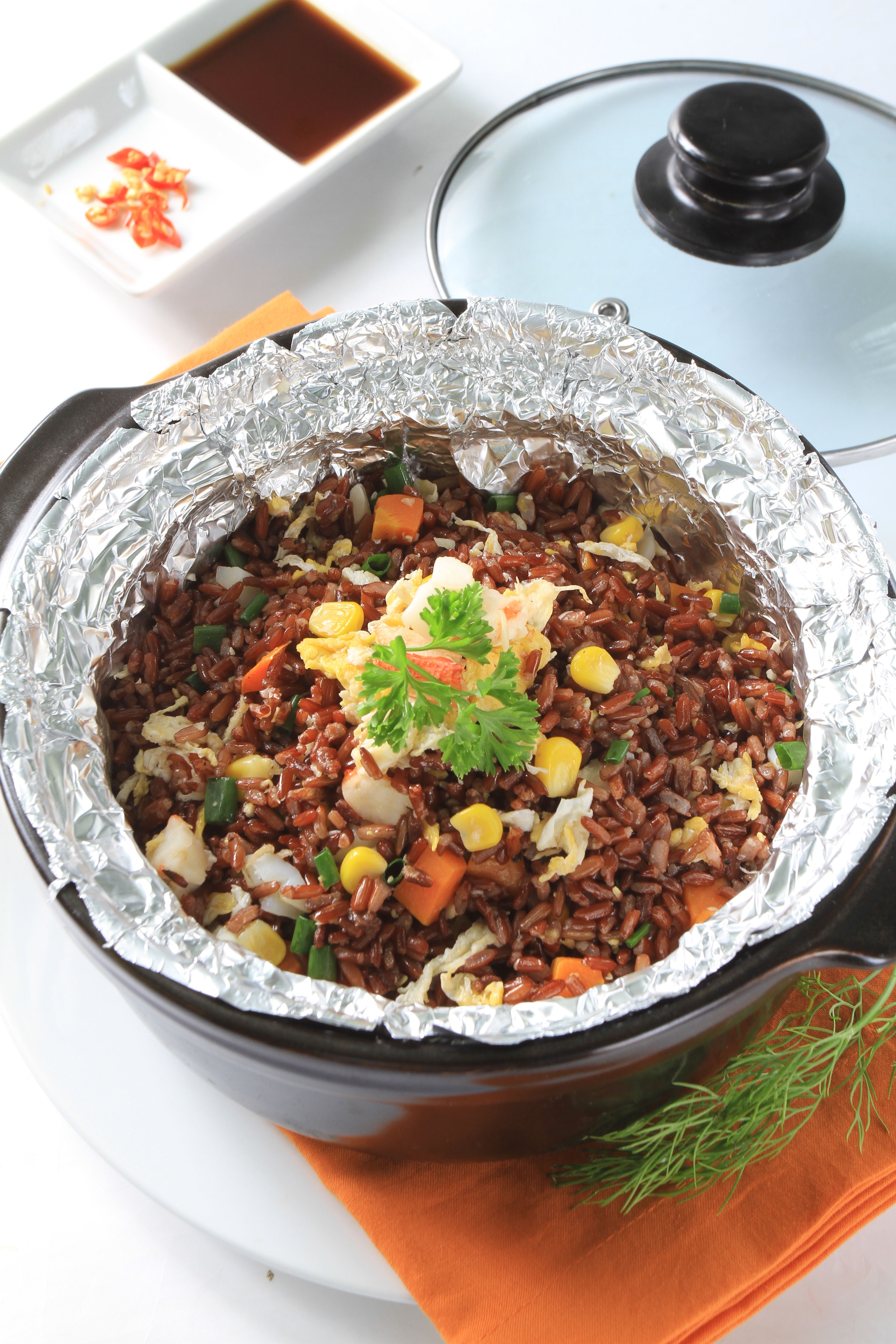 Cơm gạo lứt nướng thố ăn kèm với tương ớt.