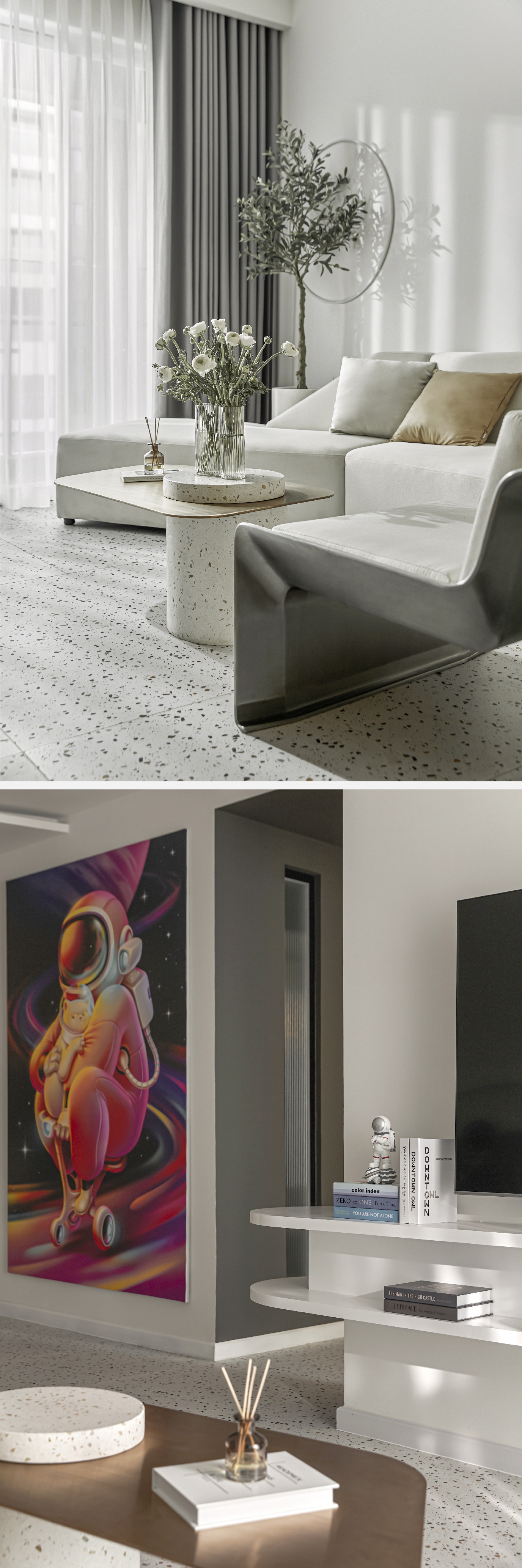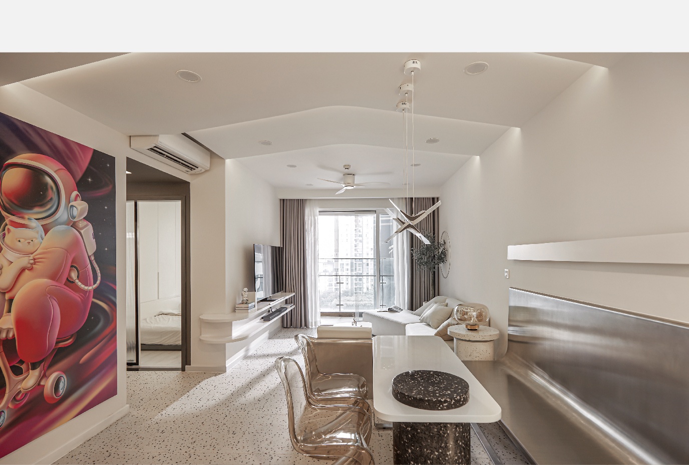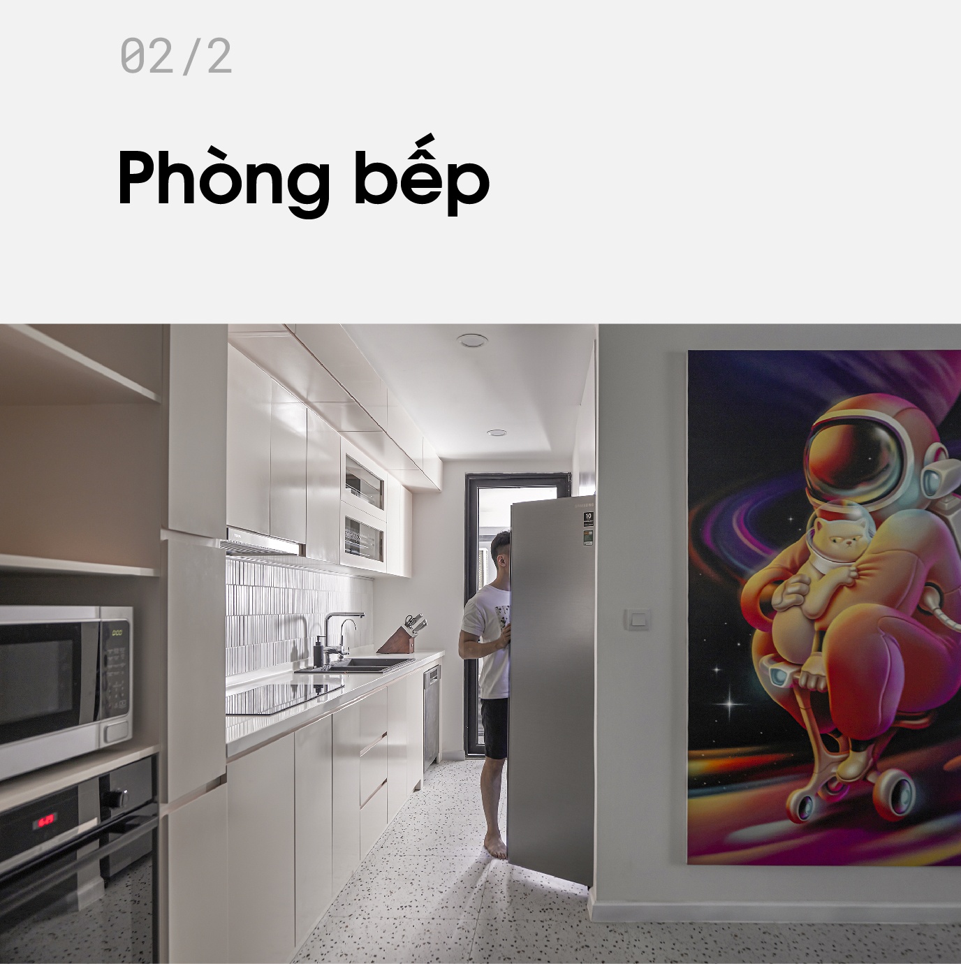 Bên cạnh đó, một điểm nhấn khác của ngôi nhà chính là bức tranh phi hành gia được Tín Dương đặt riêng. Bức tranh có chiều dài gần bằng với chiều cao căn hộ khi dựng đứng.