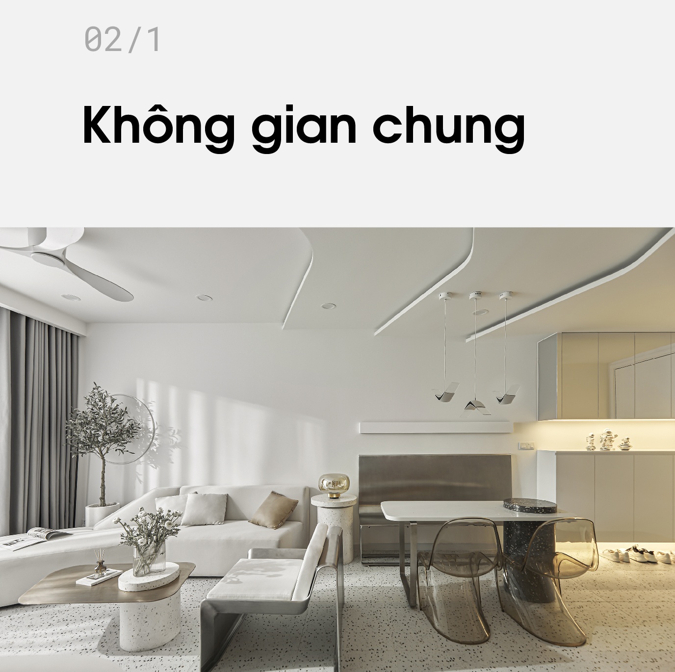 Để không gian trở nên rộng rãi hơn, Tín Dương không sử dụng tường hay vách ngăn để ngăn cách giữa phòng khách và phòng ăn.