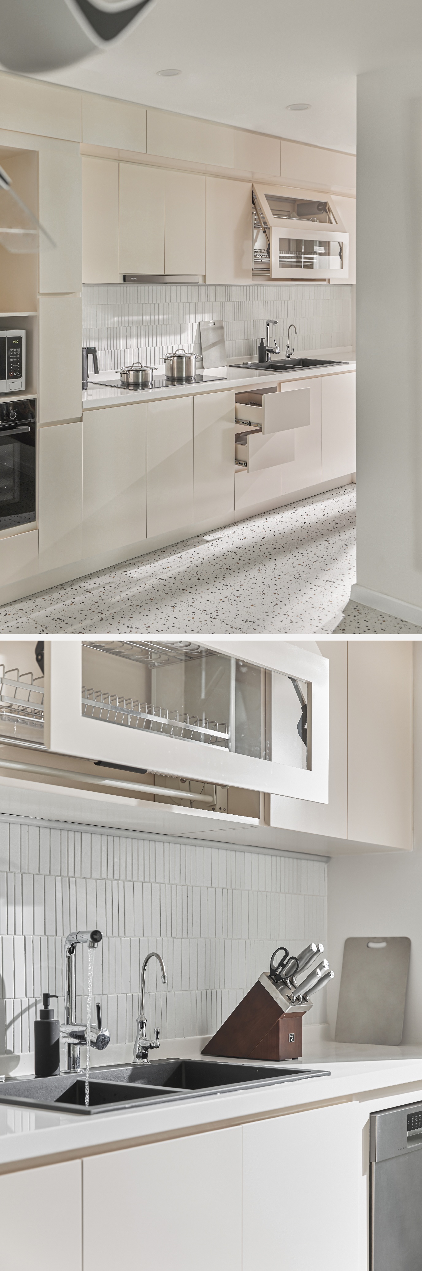 Ở khu vực này, Tín Dương phối hợp từ 3 loại gạch Mossaic khác nhau với tỷ lệ không đồng đều. Điều này sẽ tạo ra sự phá cách giúp gian bếp trở nên có hồn và thú vị hơn.