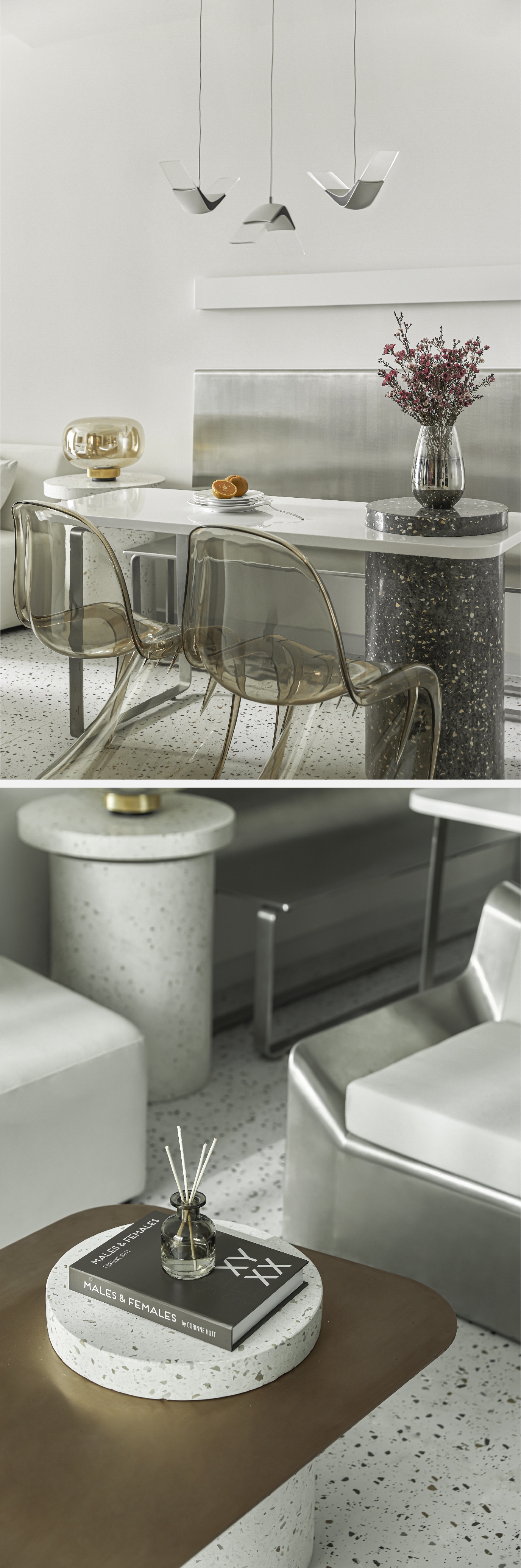 Ghế ăn inox phối cùng 2 ghế đơn, bàn ăn với trụ cột đá terrazzo kết hợp với mặt bàn bằng đá sáng màu đã tạo nên một không gian mới mẻ, độc đáo.