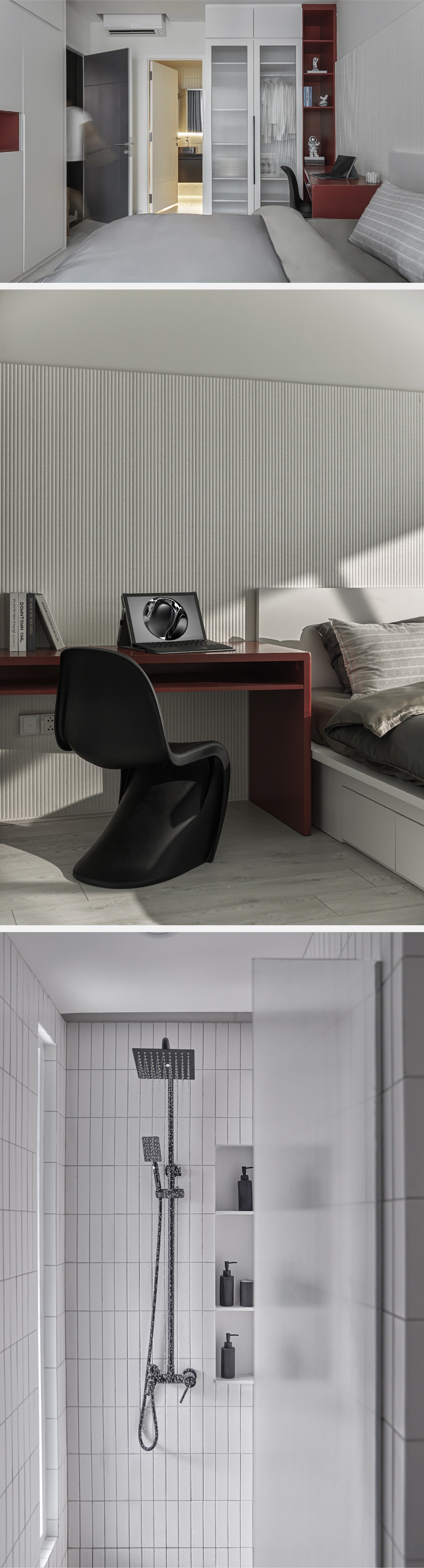 Anh chọn màu hồng cam dịu nhẹ như bình minh sớm và được cân bằng bằng một mảng màu xám đen rất mạng ở lối đi vào phòng ngủ bên cạnh.