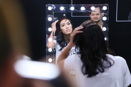 | Oanh tỏ ra không hài lòng chút nào với nhà tạo mẫu về kiểu tóc mới. |