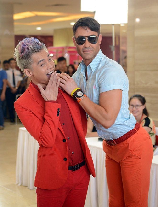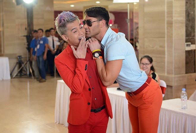 Tuy nhiên, gây ấn tượng lớn nhất với các thí sinh cũng như người hâm mộ và giới truyền thông Hà Nội vẫn là vị giám khảo tới từ Úc - Adam Williams. Anh chàng liên tục quậy tưng từ lúc rời khỏi chiếc limousine màu đen sang trọng cho tới khi sải bước trên thảm đỏ. Có những khoảnh khắc Adam còn hào hứng hôn nhẹ lên má chuyên gia trang điểm Nam Trung hoặc tinh nghịch hơn là... vỗ mông vị giám khảo nổi tiếng là đanh đá này. Những hành động tình tứ đồng giới này không khỏi khiến Nam Trung... hốt hoảng.
