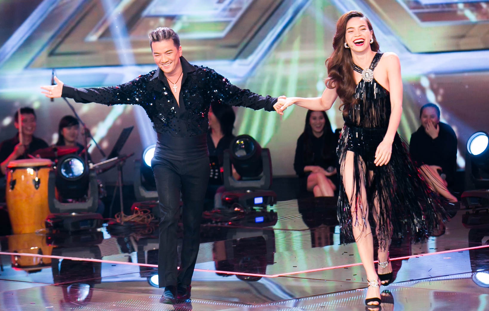 | Hồ Ngọc Hà xuất hiện nổi bật với bộ đầm tua rua cùng mái tóc óng ả, suôn mượt quyến rũ bên Đàm Vĩnh Hưng. Đúng với tinh thần của đêm thi dạ vũ, hai giám khảo đã có những bộ cánh không thể nào phù hợp hơn. |